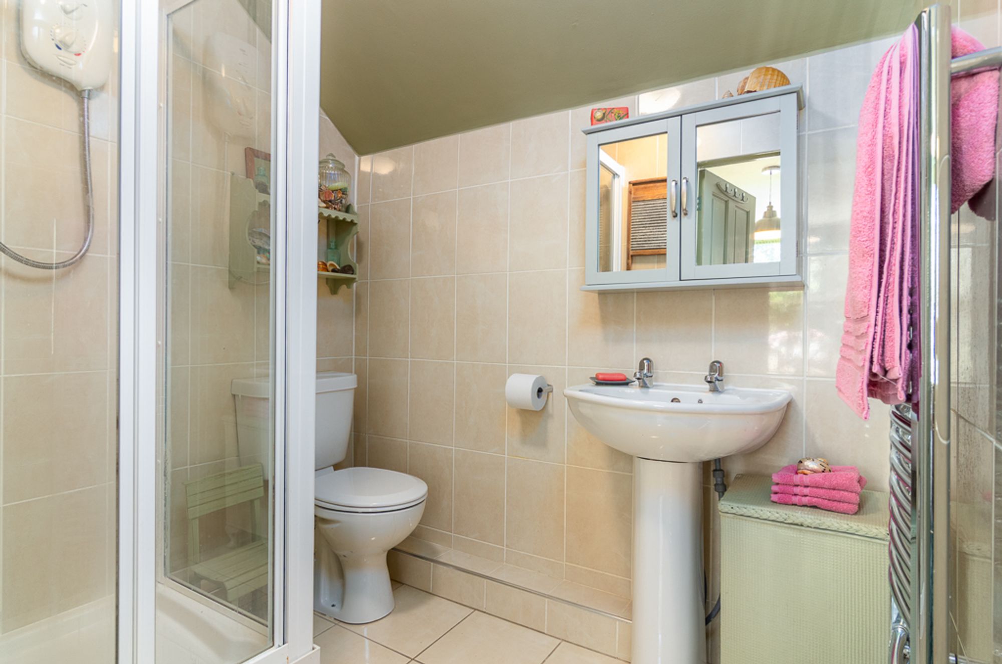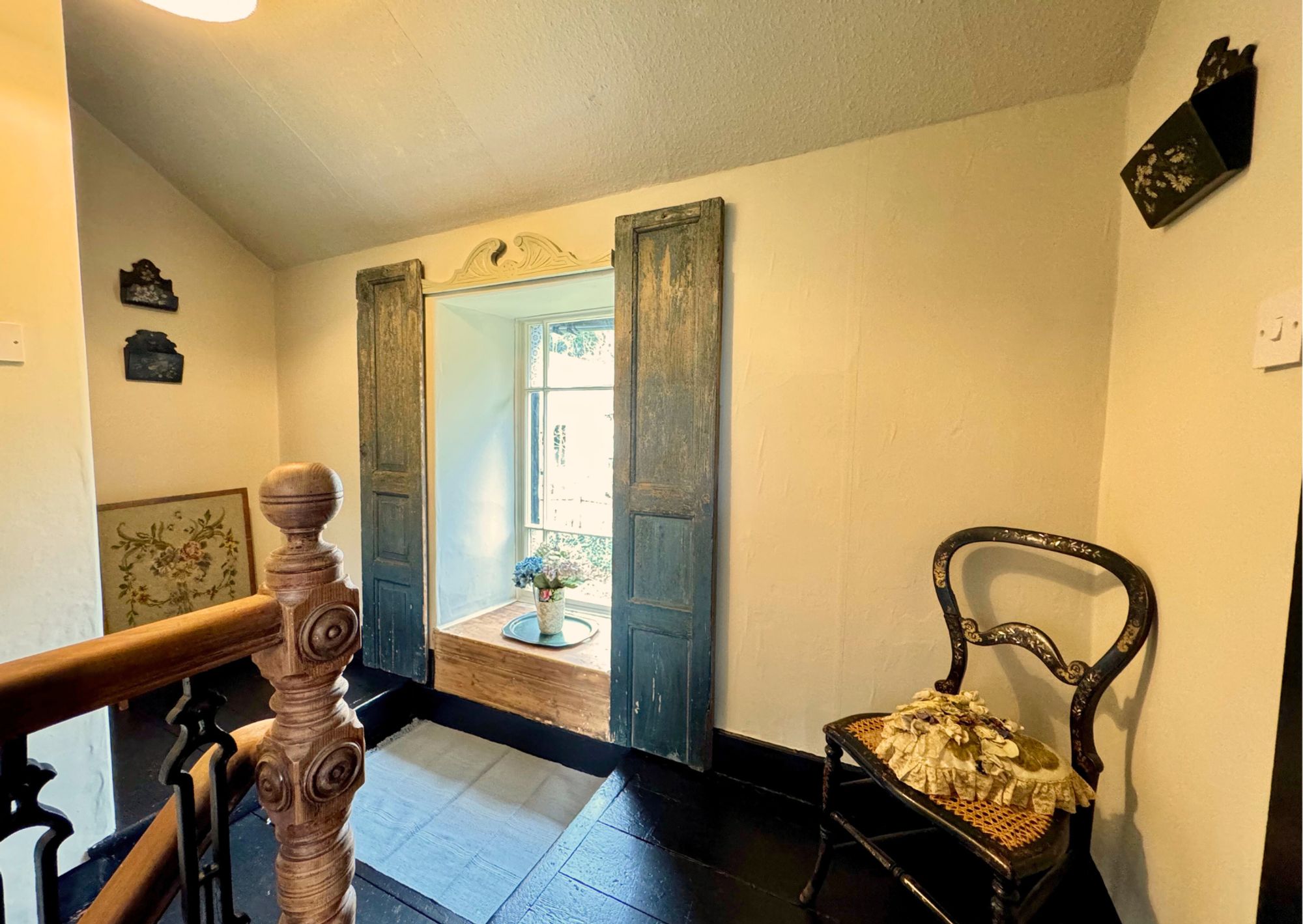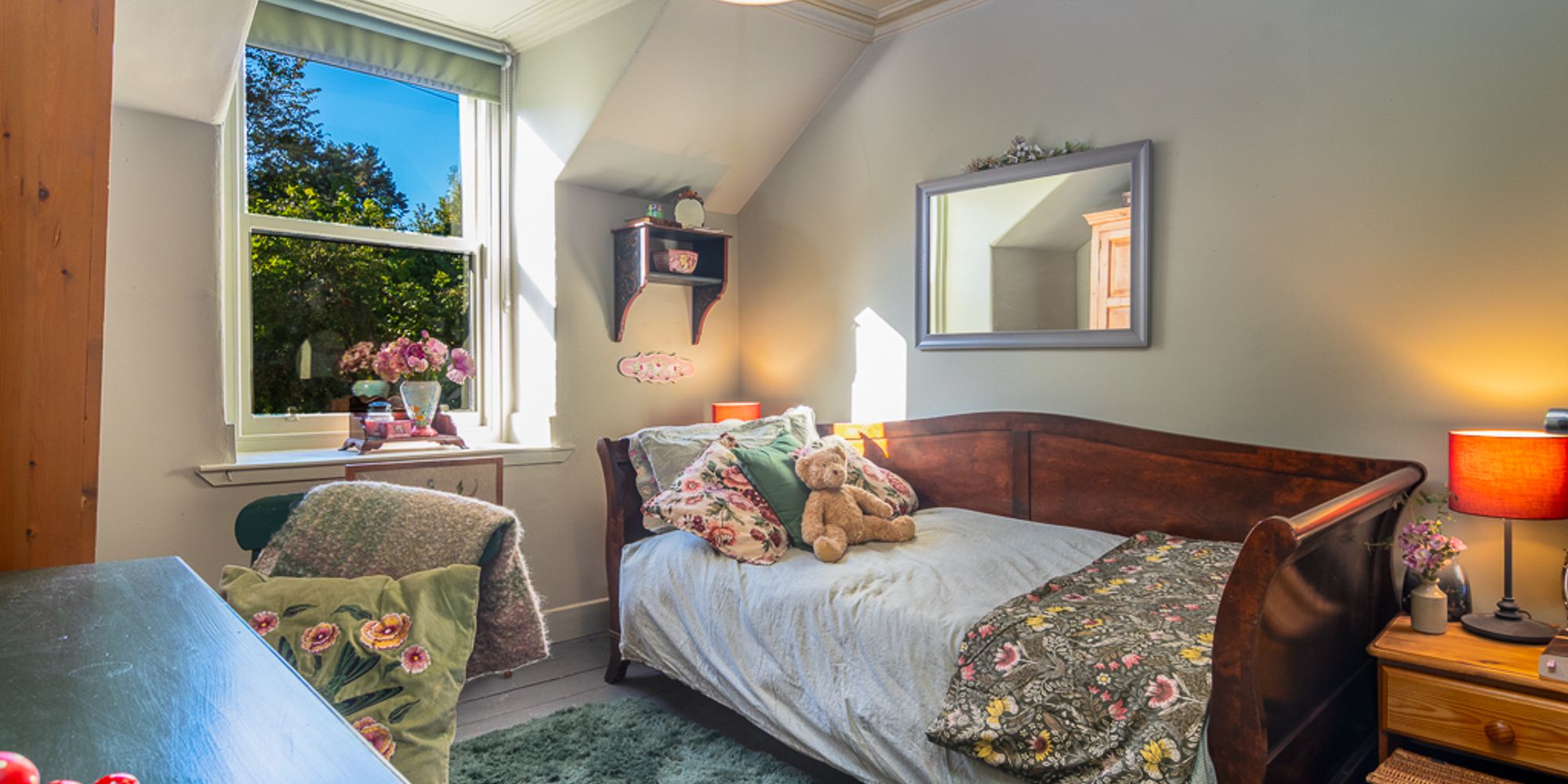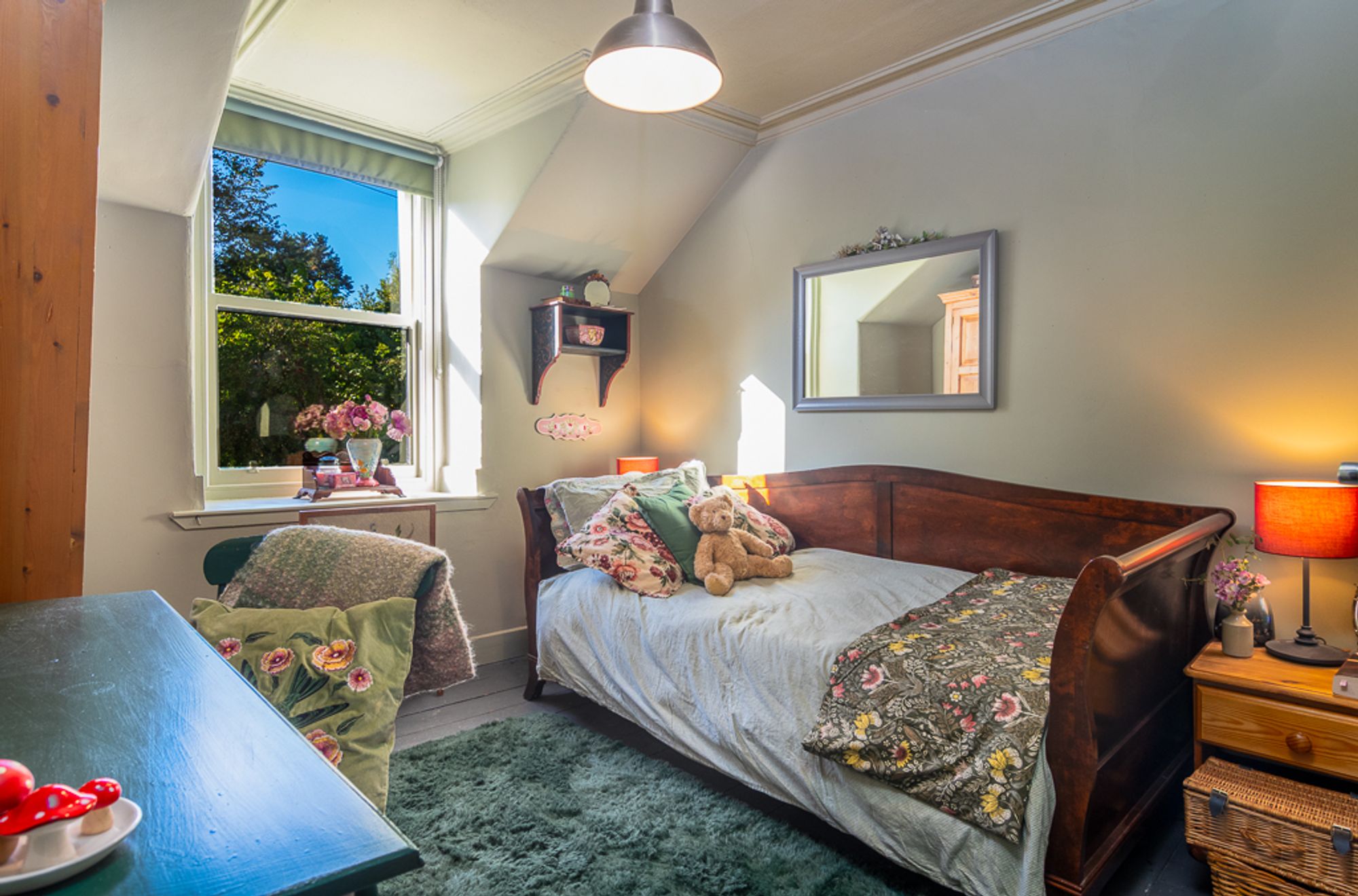 Upstairs, the smaller bedroom boasts a private ensuite shower room, while the family bathroom features a three-piece suite and electric shower. The main bedroom has been thoughtfully adapted, converting a historic bed recess into generous wardrobe space, balancing quirks with practicality.