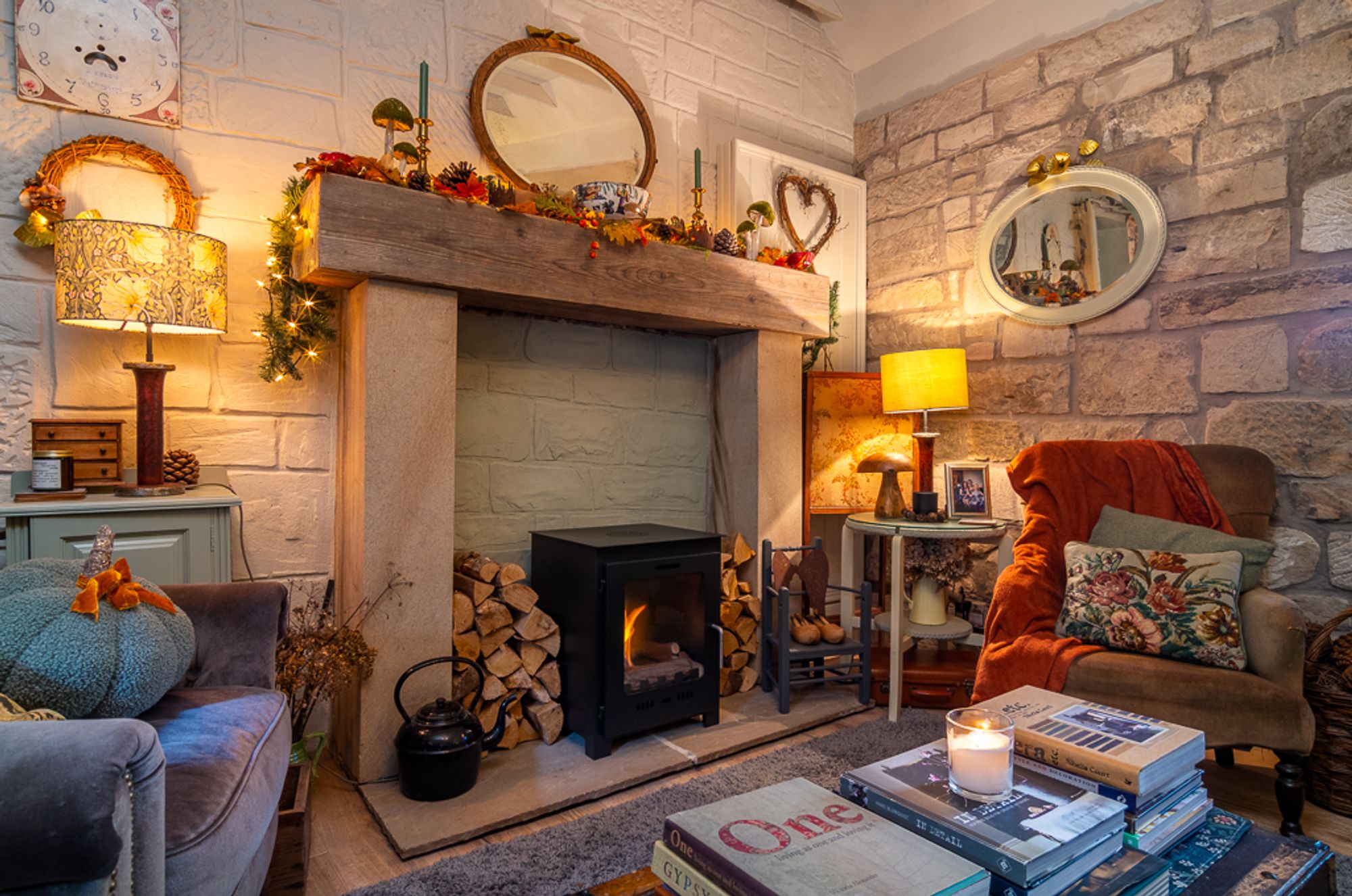 A graceful staircase rises to the two main bedrooms, while to the left a snug room with a decorative fireplace leads into the main lounge. The original hearth has been gently covered, yet the chimney remains within the thick walls, a quiet reminder of fires past. Today, a bioethanol stove casts a soft glow, perfect for curling up with a book or enjoying a quiet afternoon. Exposed sandstone walls and sturdy beams lend rustic intimacy, and the tall mantle welcomes seasonal decorations and cherished trinkets.
