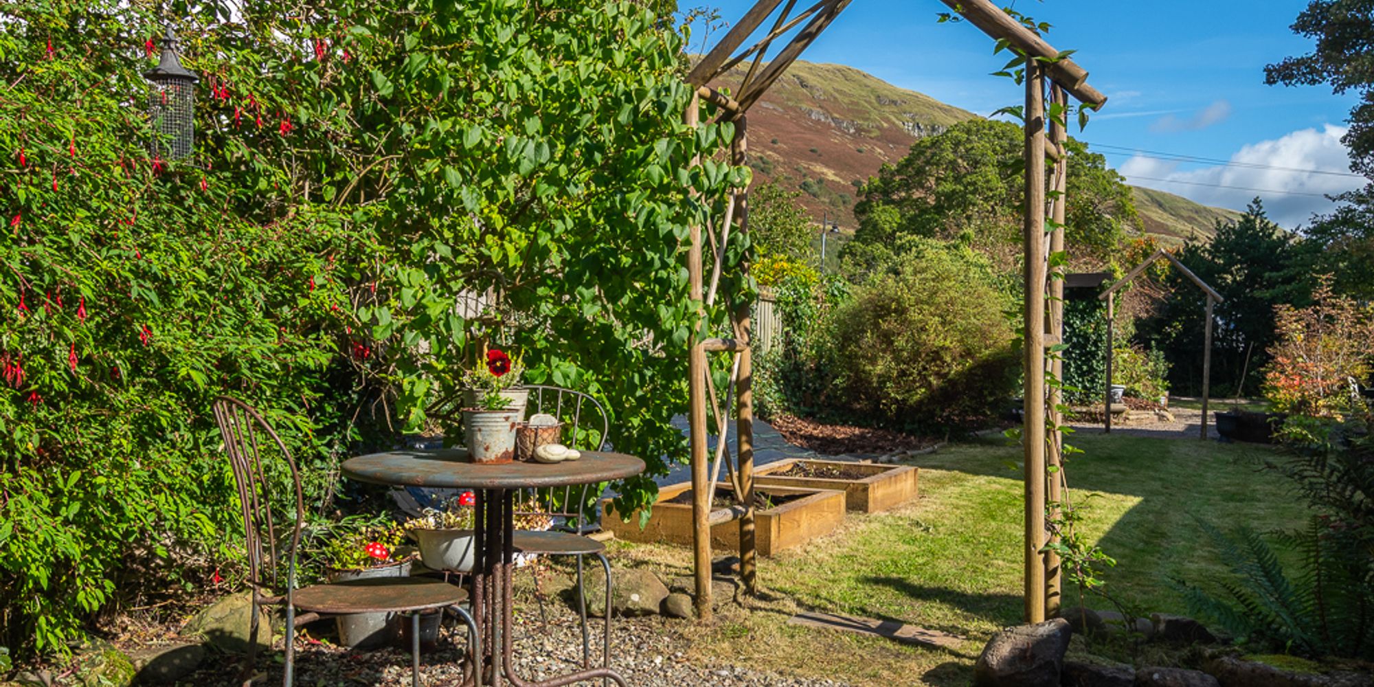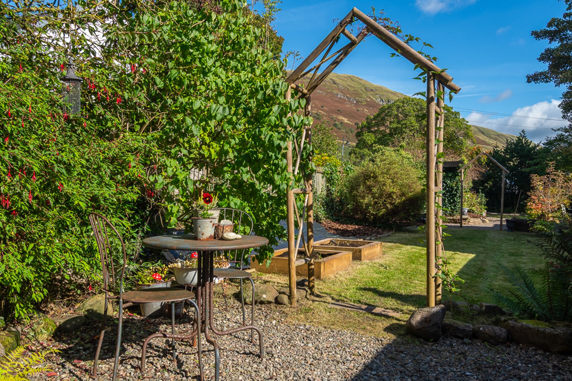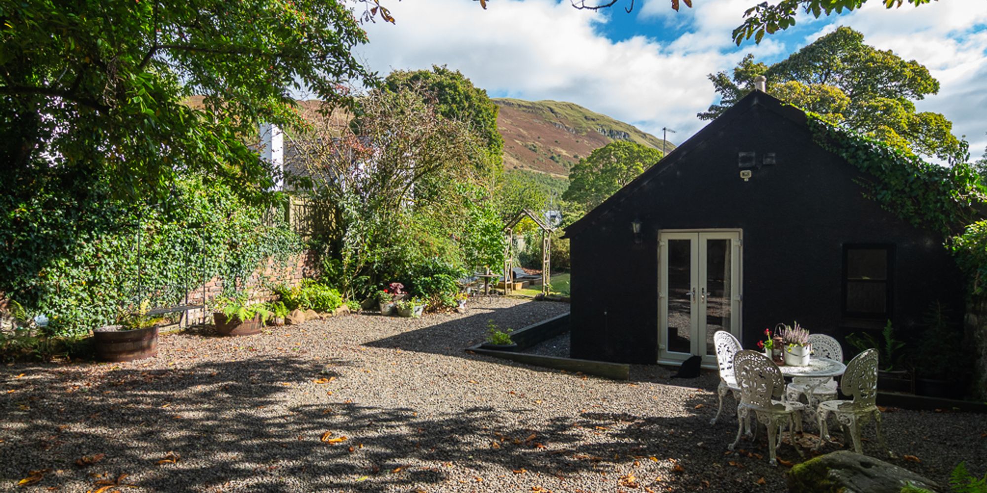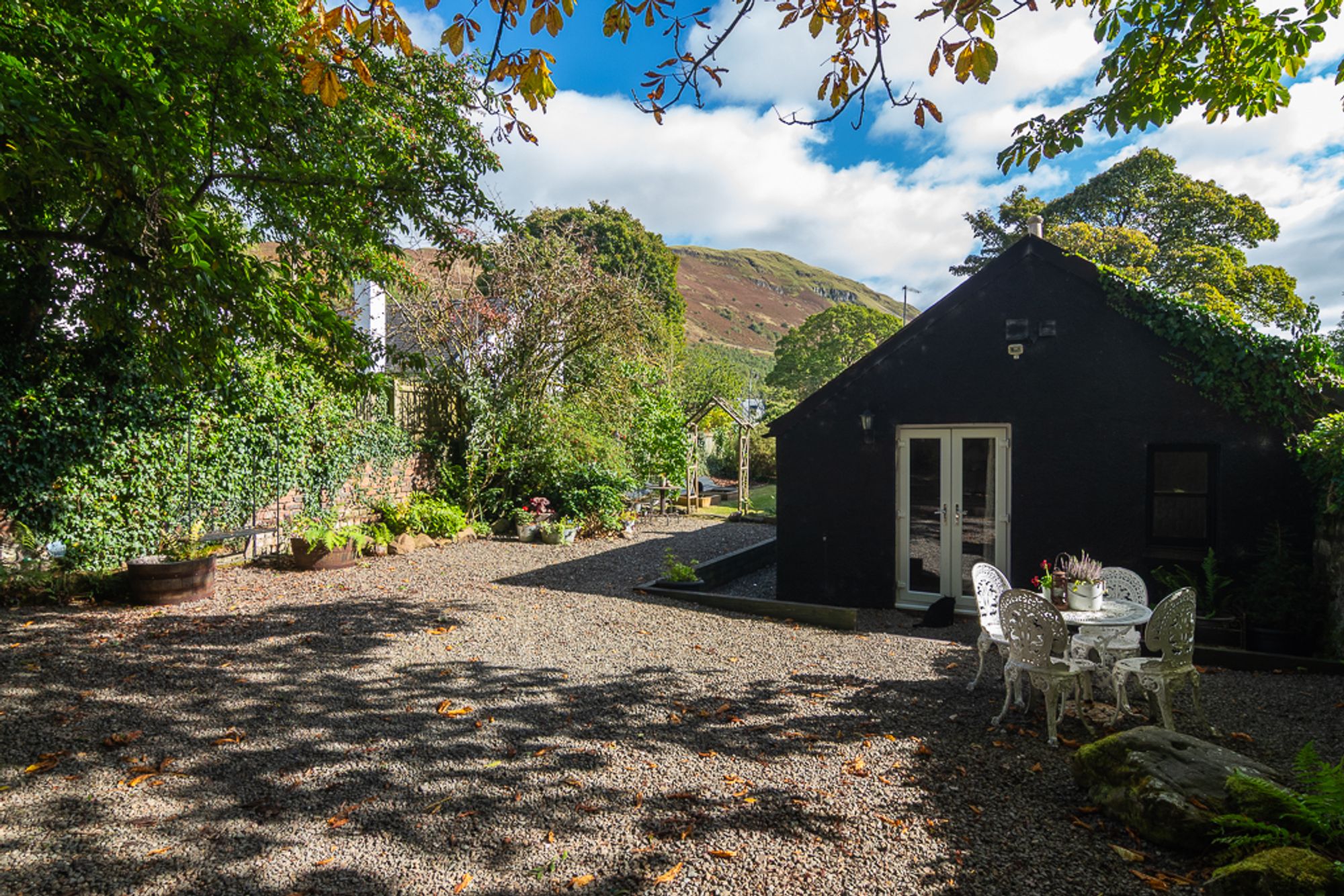 Outside, the magic continues. A generous chipped driveway leads to a timber garage, while the former car port has been transformed into a whimsical outdoor seating area. Fairy lights twinkle above and gentle heaters provide warmth on crisp autumn evenings. Here, family gatherings and quiet reflections are shared alike, with mugs of hot chocolate in hand, the Kirk burn murmuring nearby, and the woodland alive with life.