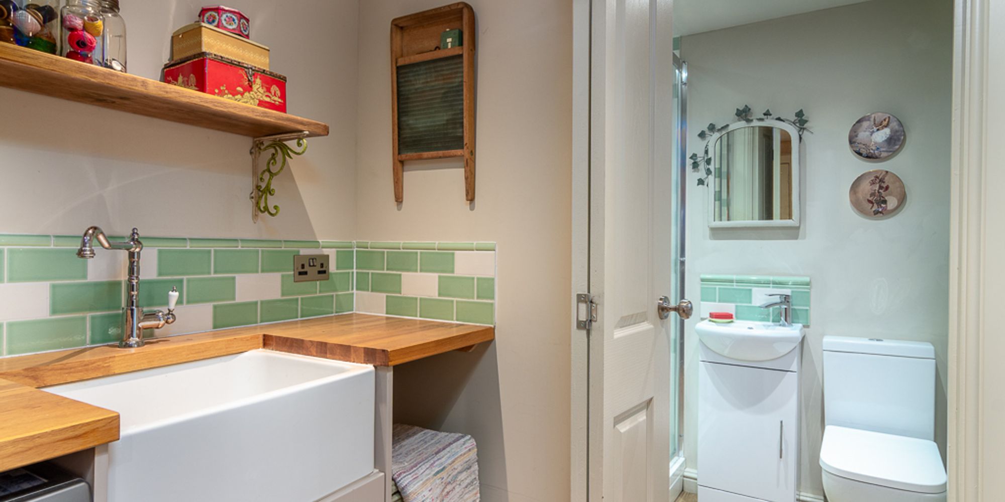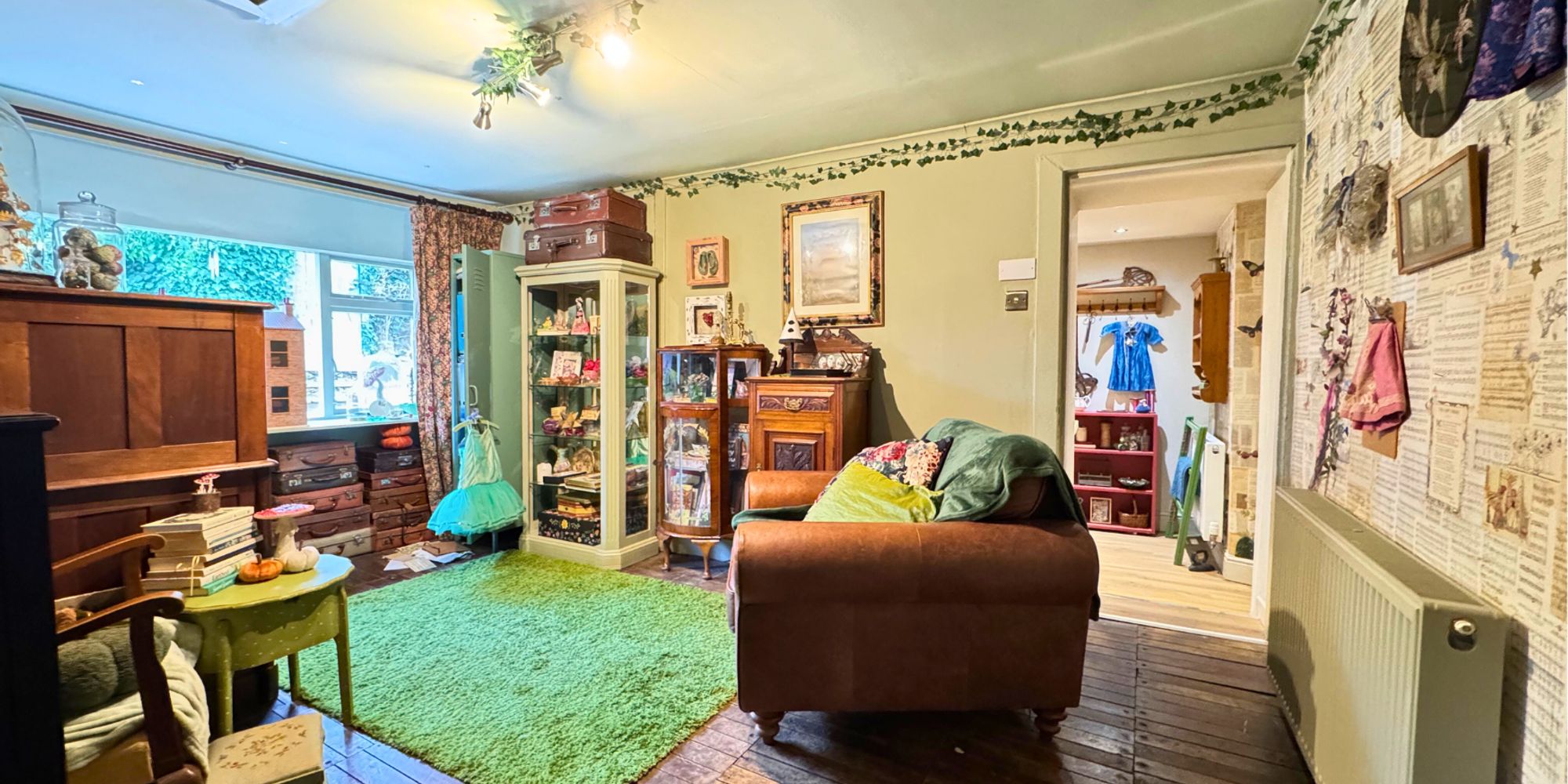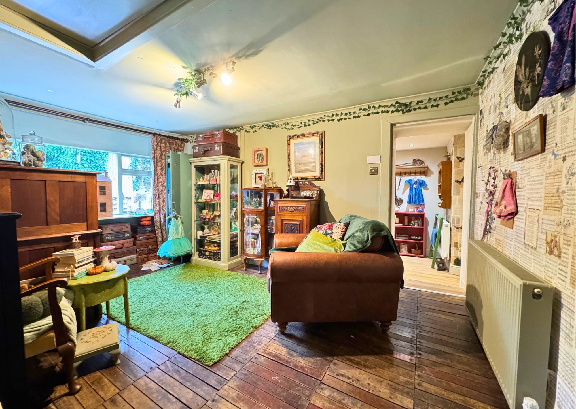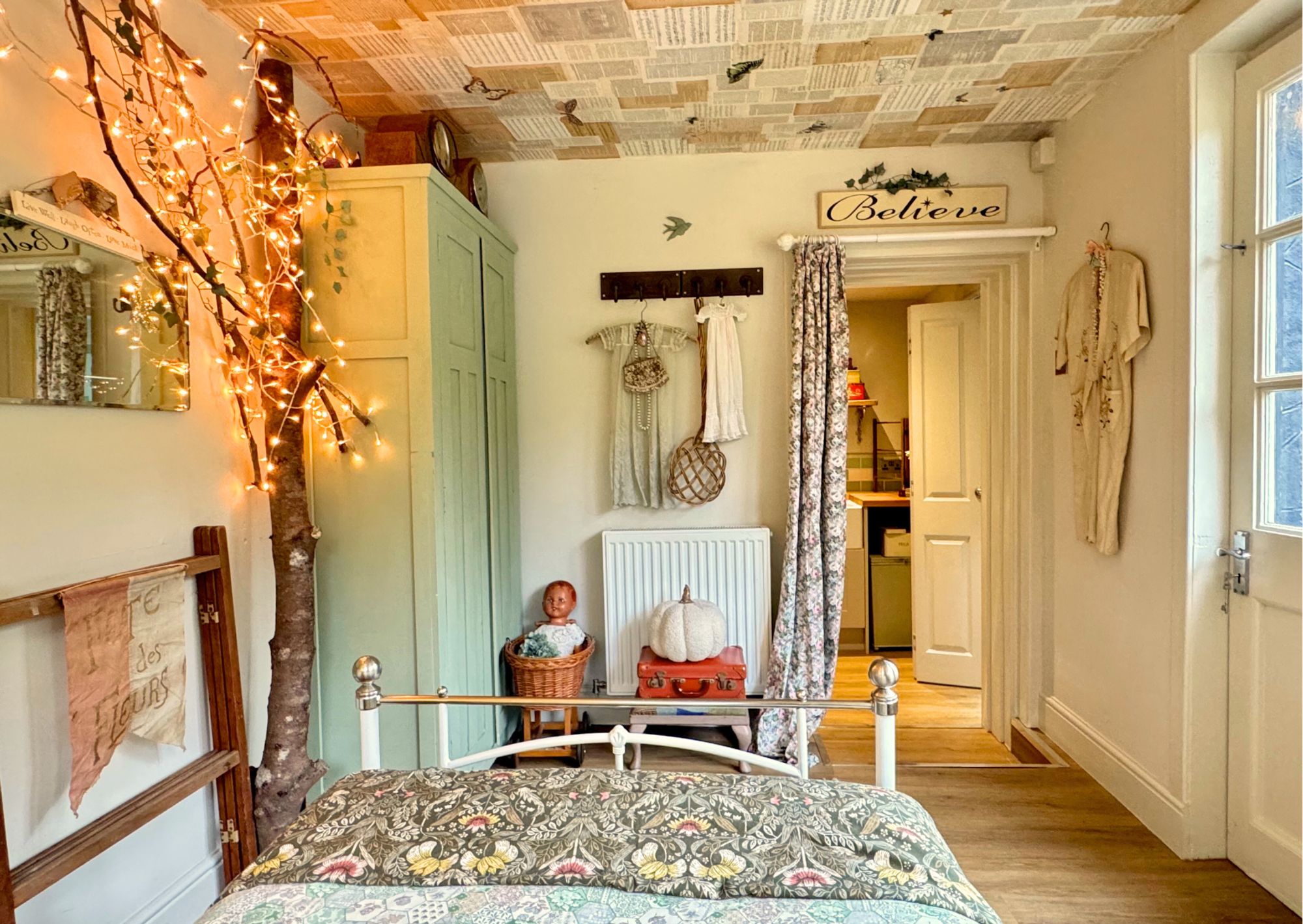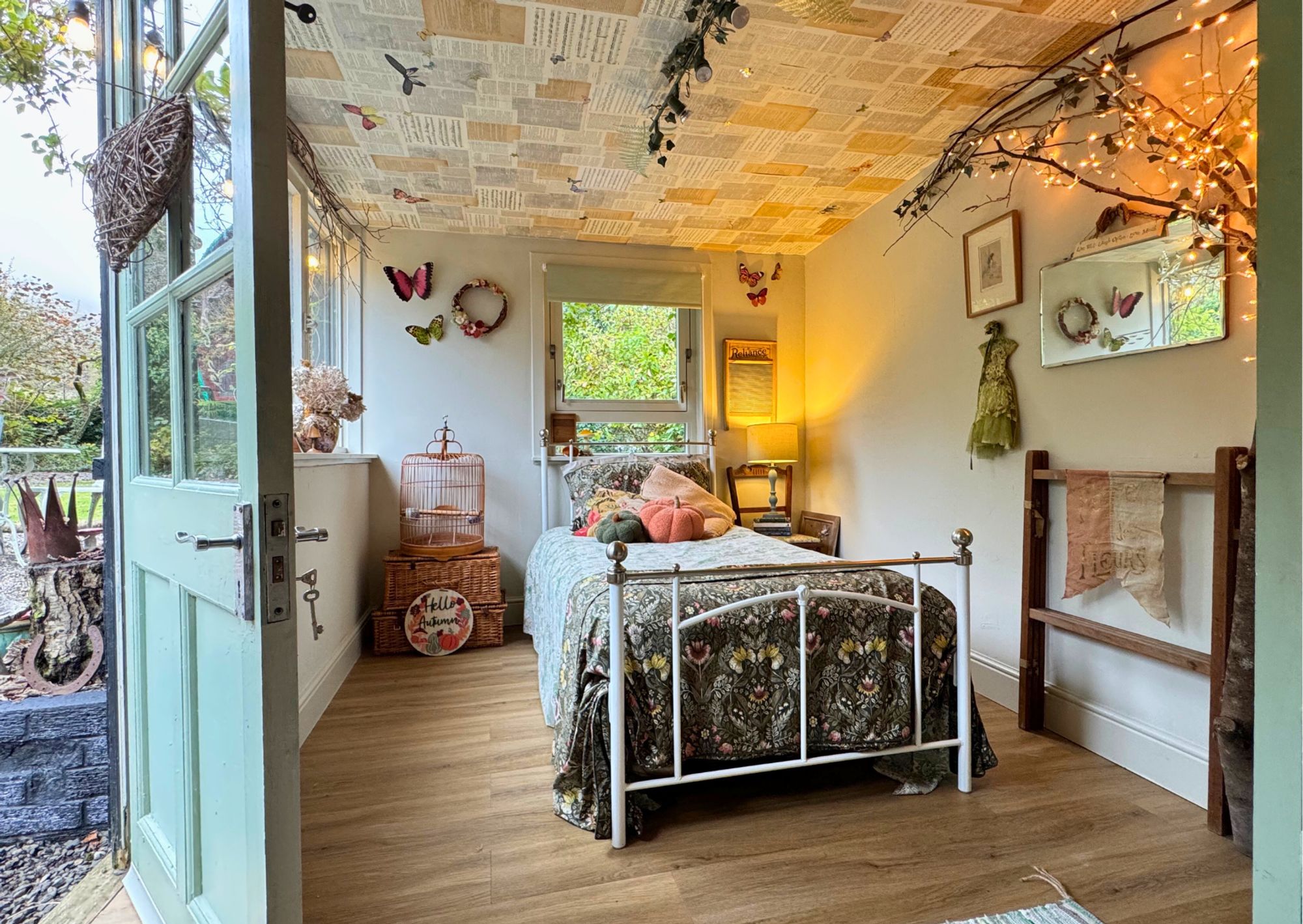 At the far end of the house, two versatile rooms currently serve as a study and hobby room, each with whimsical touches. Cosy desk nooks invite poetry, song, or quiet reflection, while the spaces could easily transform into a dining room, playroom, or extra bedrooms. Adjacent, the utility and shower rooms are adorned with soft sage green and white tiles, Belfast sink, and oak worktops. Beyond the utility, an additional bedroom opens directly onto the garden, creating a seamless flow to Rosa, the enchanting Gypsy caravan. Transformed into a magical outdoor bedroom, she offers the rare delight of sleeping under the stars on warm summer nights.