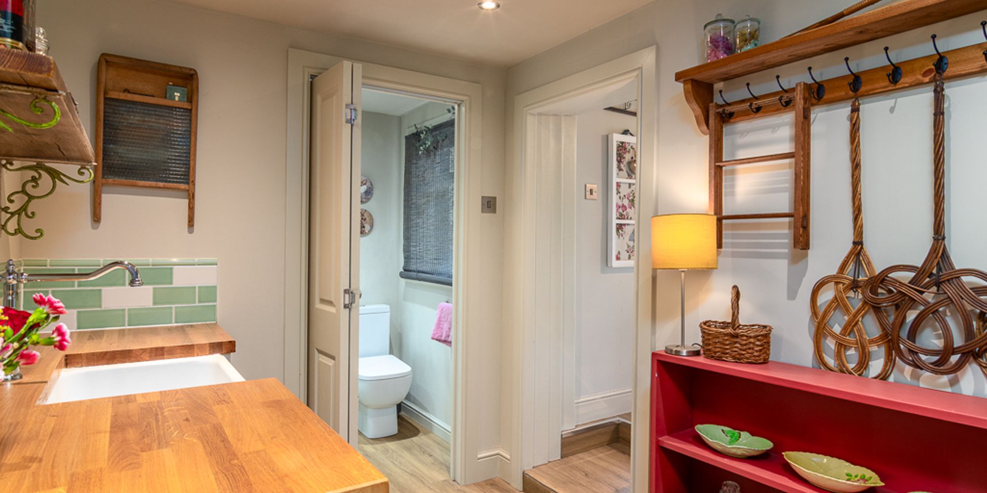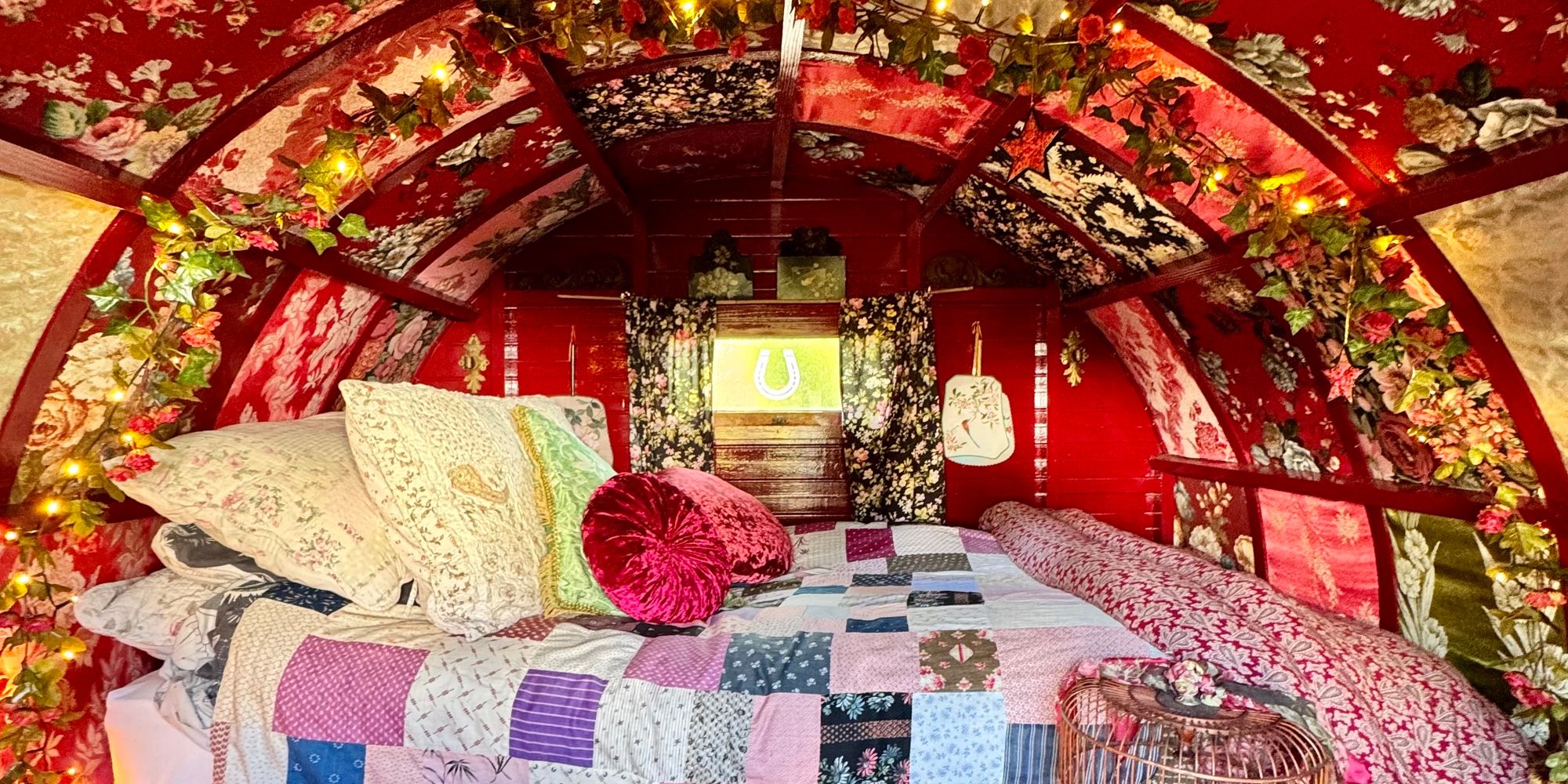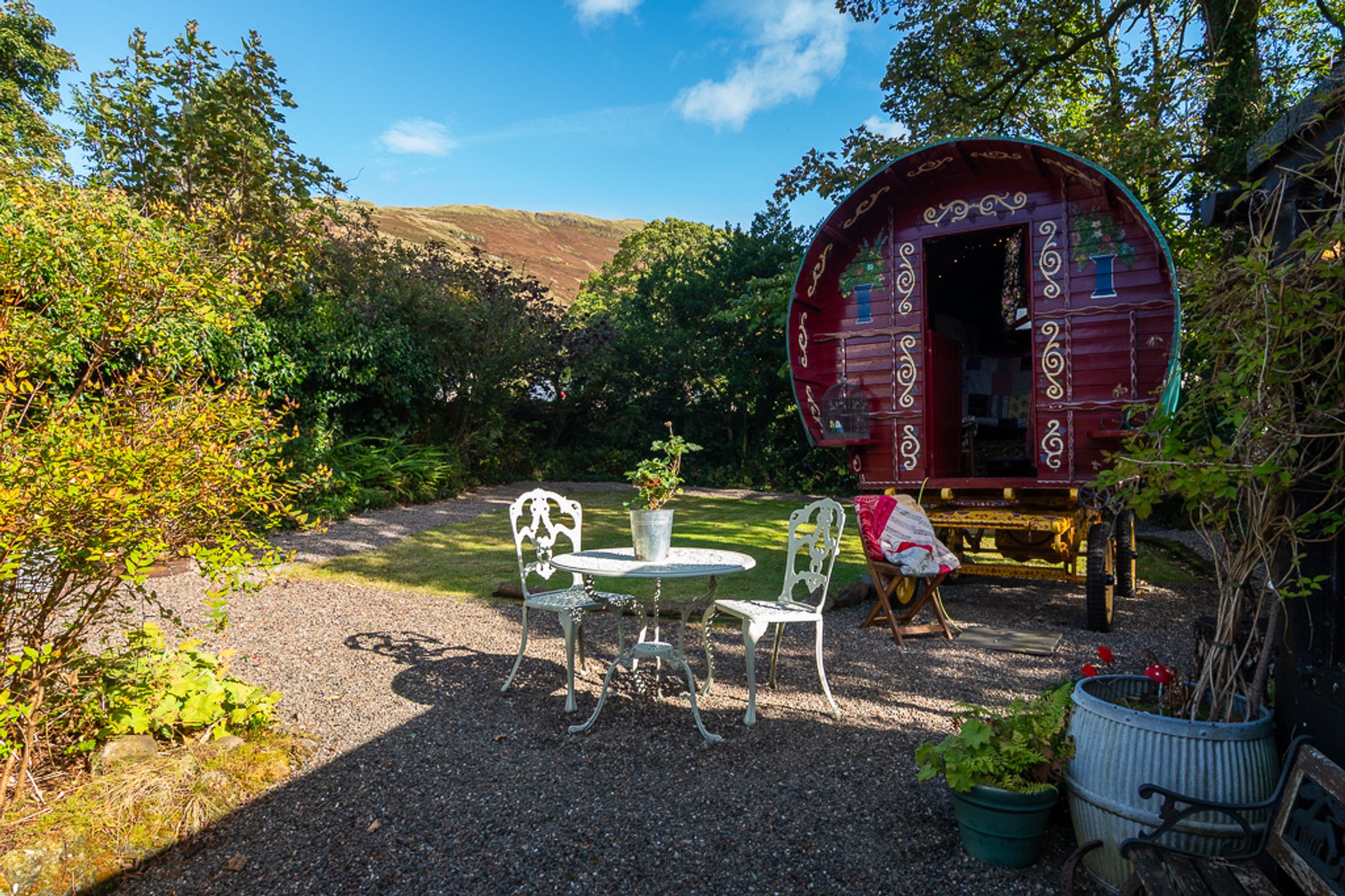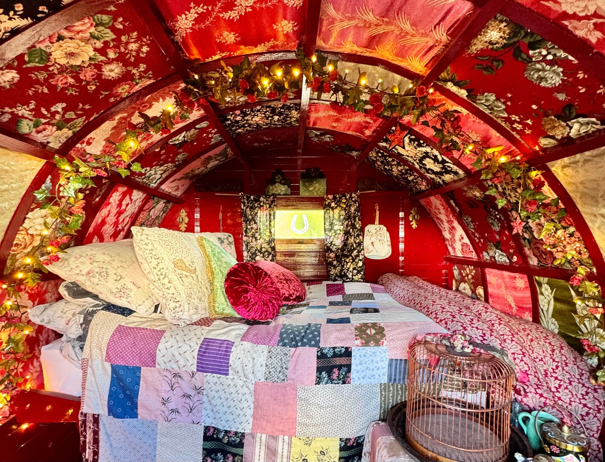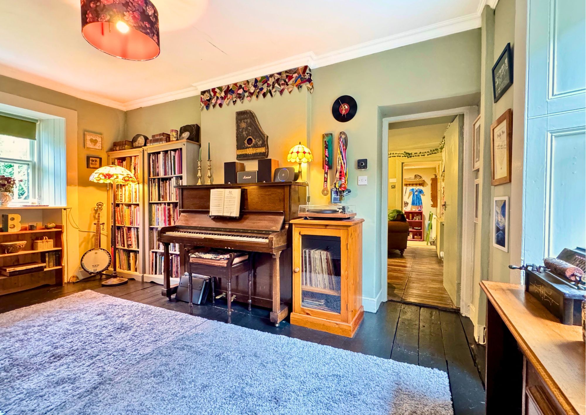 At the far end of the house, two versatile rooms currently serve as a study and hobby room, each with whimsical touches. Cosy desk nooks invite poetry, song, or quiet reflection, while the spaces could easily transform into a dining room, playroom, or extra bedrooms. Adjacent, the utility and shower rooms are adorned with soft sage green and white tiles, Belfast sink, and oak worktops. Beyond the utility, an additional bedroom opens directly onto the garden, creating a seamless flow to Rosa, the enchanting Gypsy caravan. Transformed into a magical outdoor bedroom, she offers the rare delight of sleeping under the stars on warm summer nights.