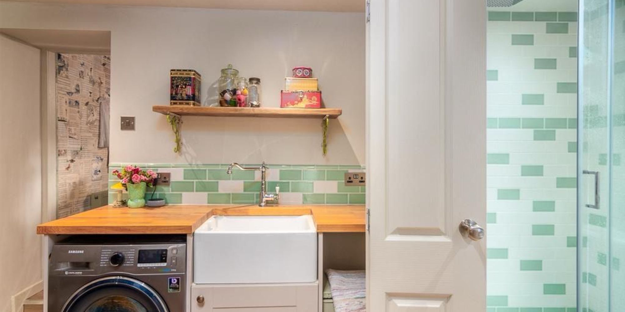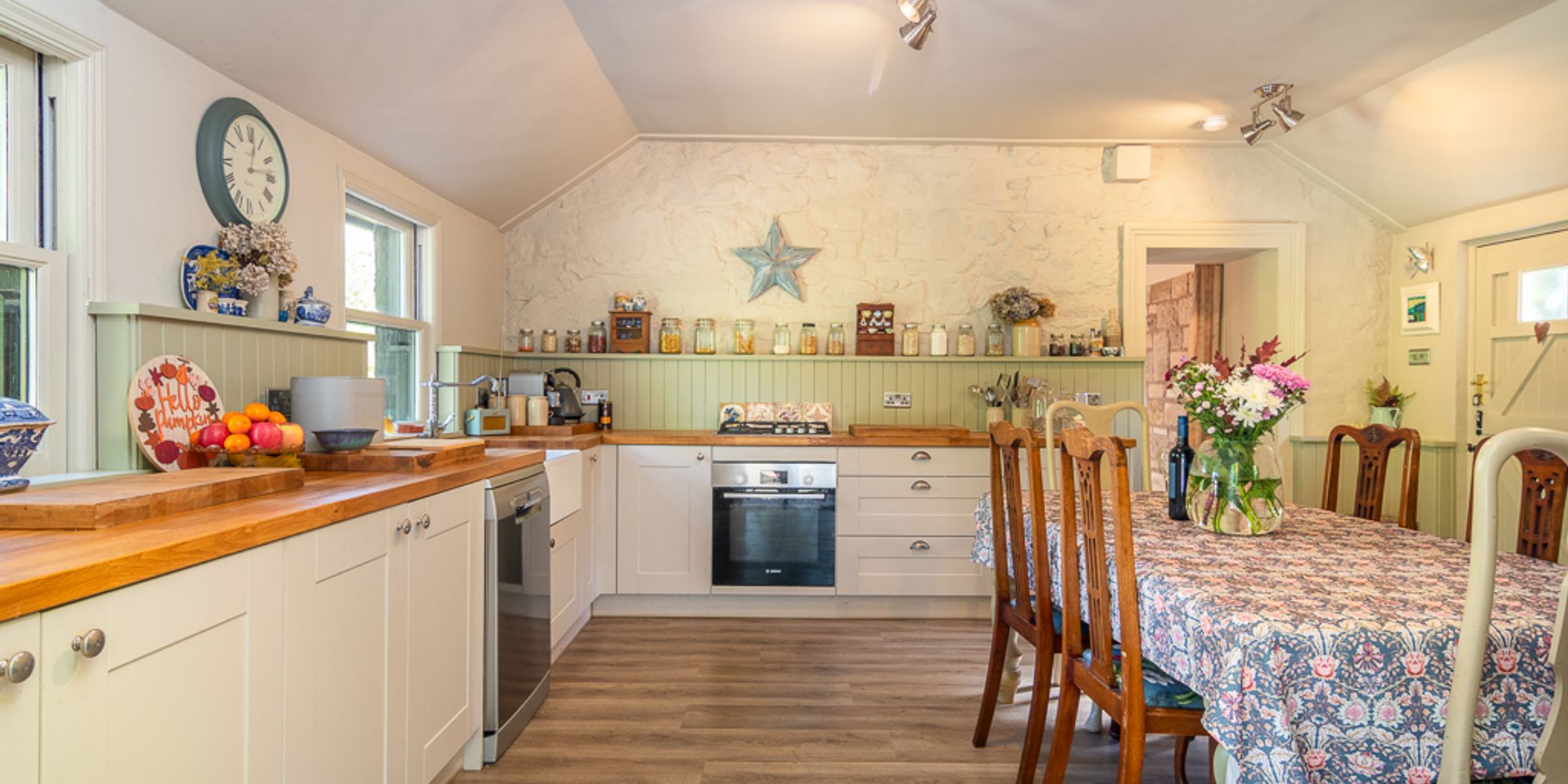 The heart of the home, the kitchen, is a baker’s dream. Sunlight spills through dual-aspect windows and French doors, illuminating sage-green tongue-and-groove panelling that creates the perfect shelf for jars of dried ingredients, keeping them beautifully displayed and within easy reach. Creamy shaker cabinets and rich oak butcher block countertops complete the scene. A deep Belfast sink gleams beneath the window, overlooking the private garden as the quaint stable door opens to a wash of greenery. This is a space made for laughter-filled breakfasts, leisurely afternoons with tea, and long evenings shared with friends and family. For added convenience, the dishwasher, fridge and washing machine will be included in the sale.