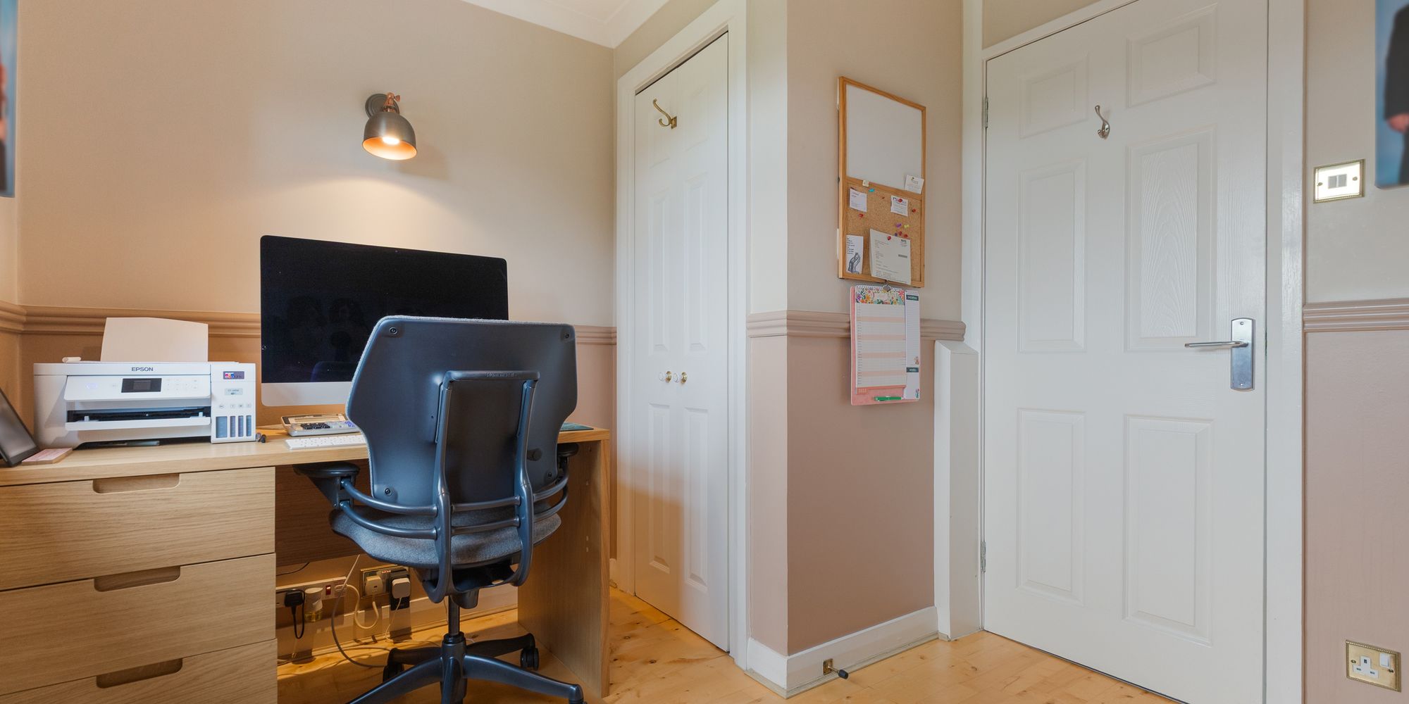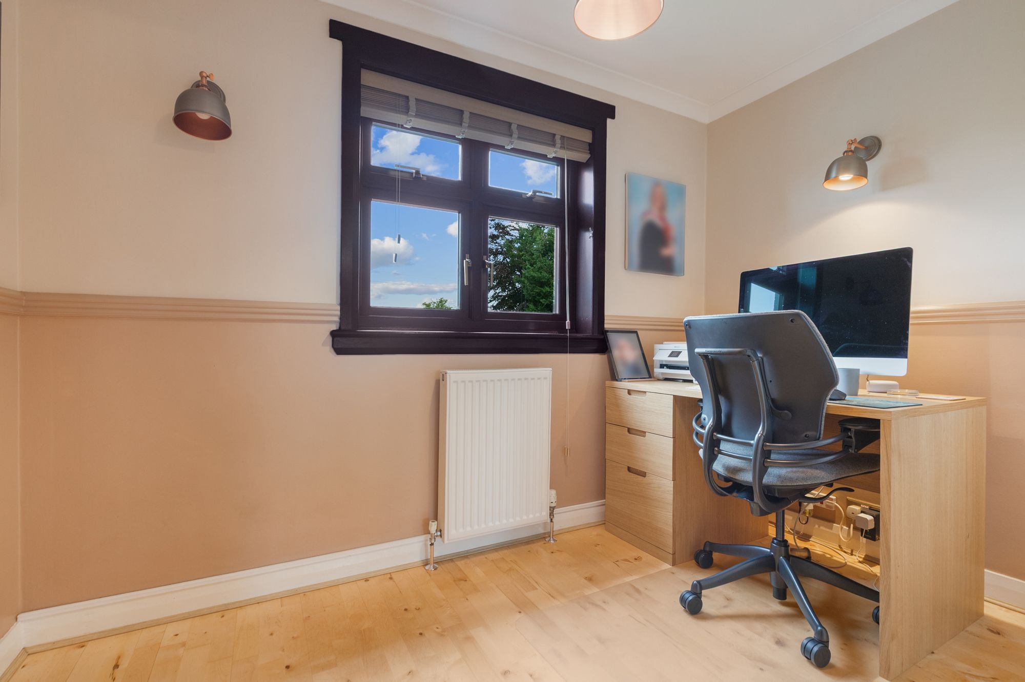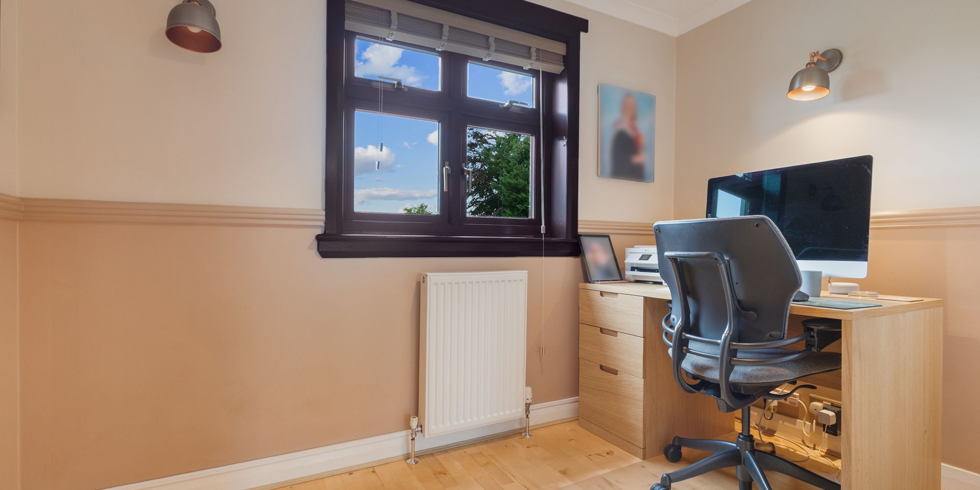 Upstairs, three inviting bedrooms provide space and flexibility. The principal bedroom offers a generous retreat with a calming, light-filled ambience. The second bedroom is spacious and versatile, ideal for family or guests. The third room, currently a home office, is perfectly suited to modern living and benefits from excellent natural light. Neutral tones throughout ensure each room is ready to be styled to personal taste.