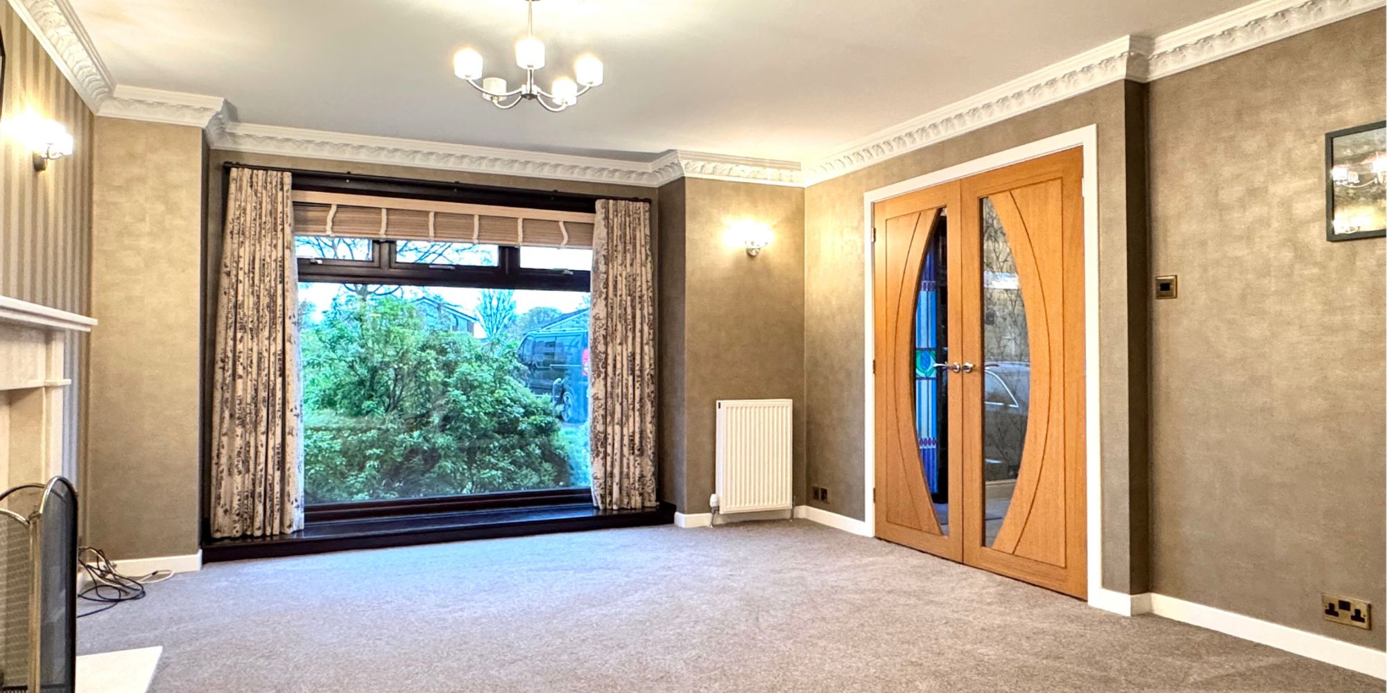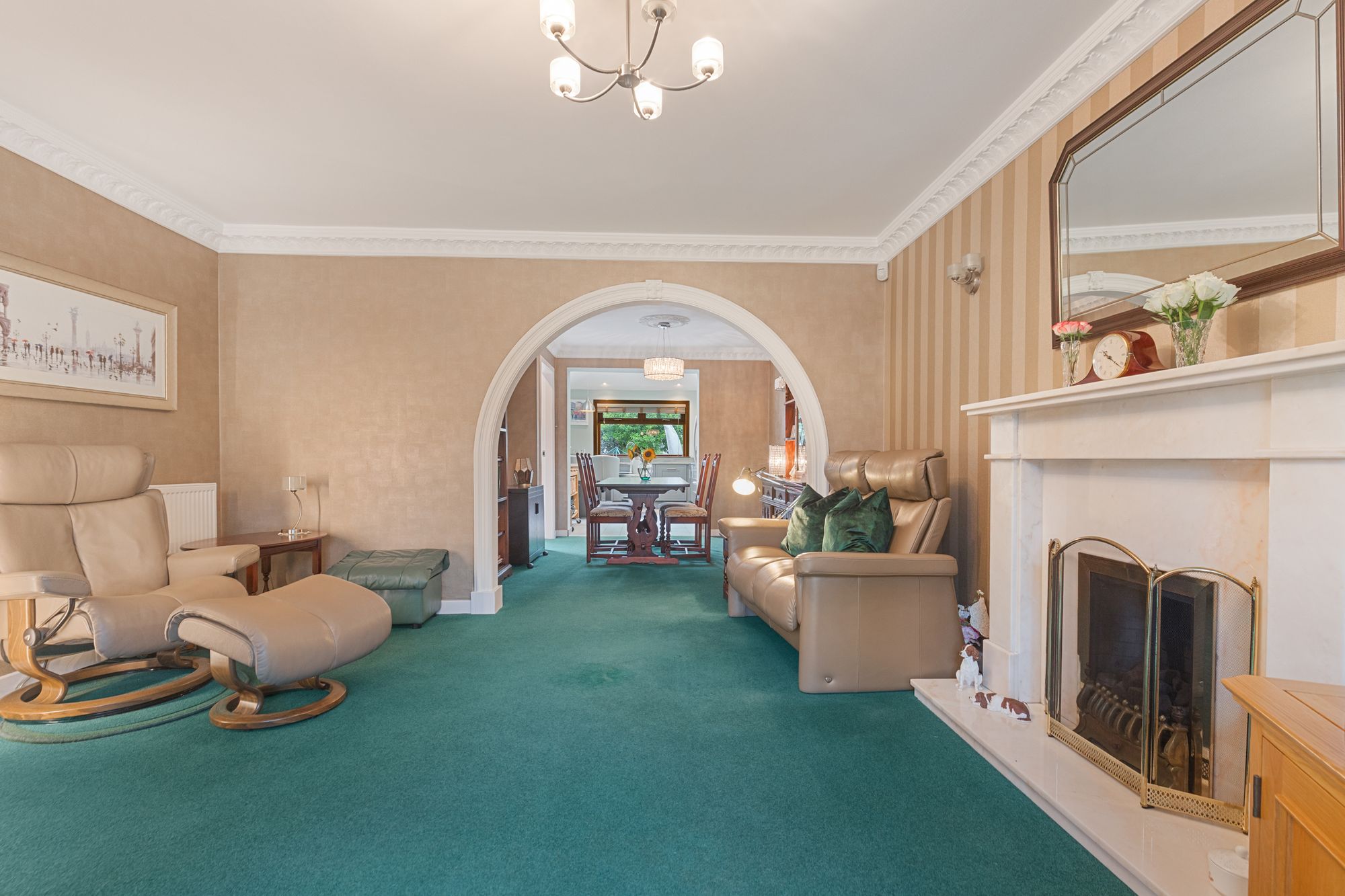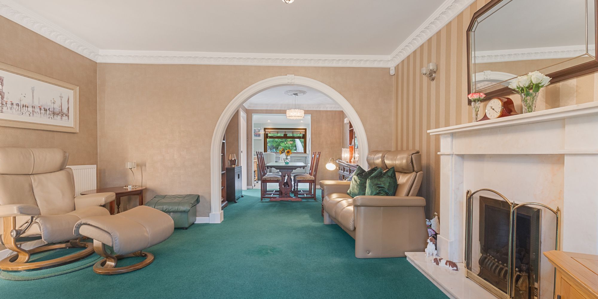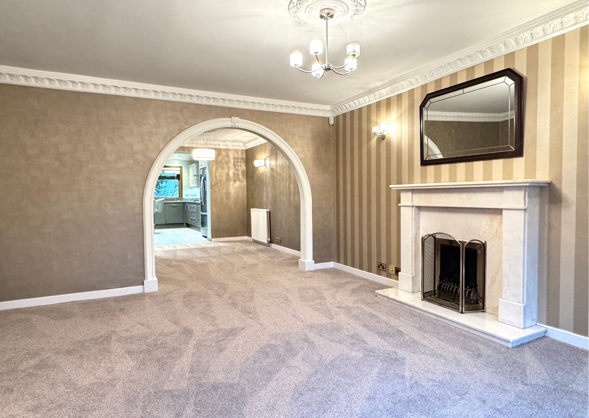 Step through the traditional glass-paned wooden door and into an impressive hallway where porcelain tiles and a glass balustrade with an oak handrail create an immediate sense of sophistication. To the right, double oak doors open to a generous, newly carpeted lounge filled with natural light from a wide picture window. A marble fireplace adds warmth and a welcoming glow, making this the perfect setting for family gatherings or relaxed evenings.