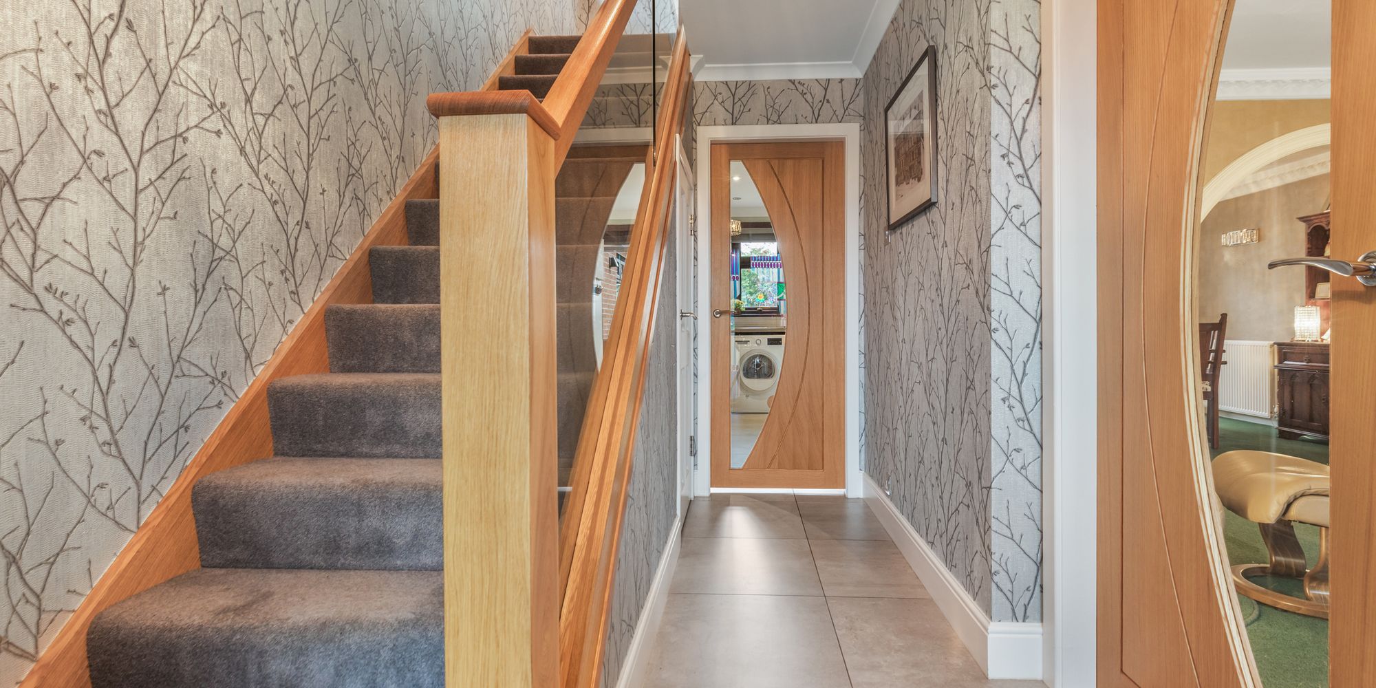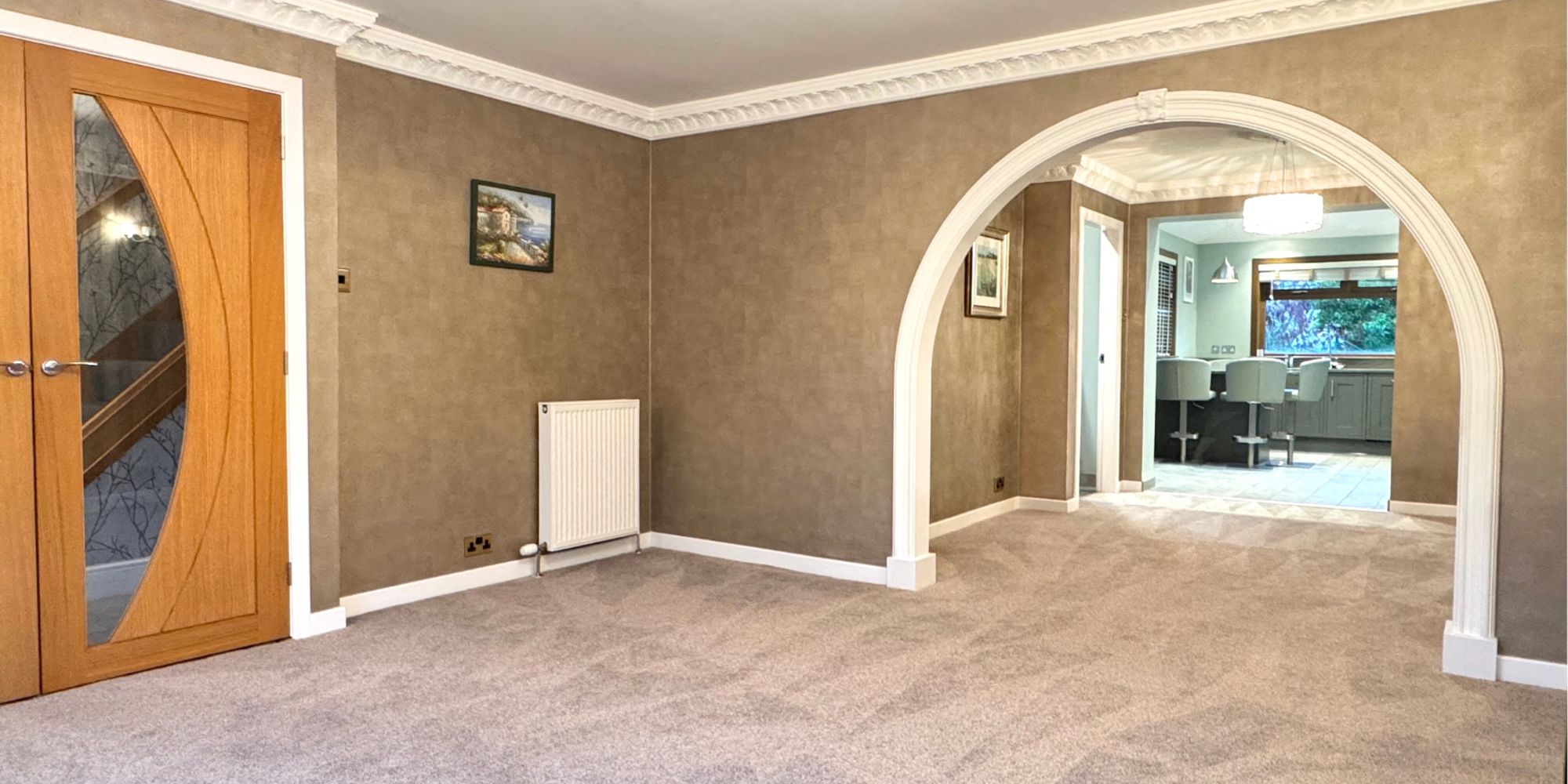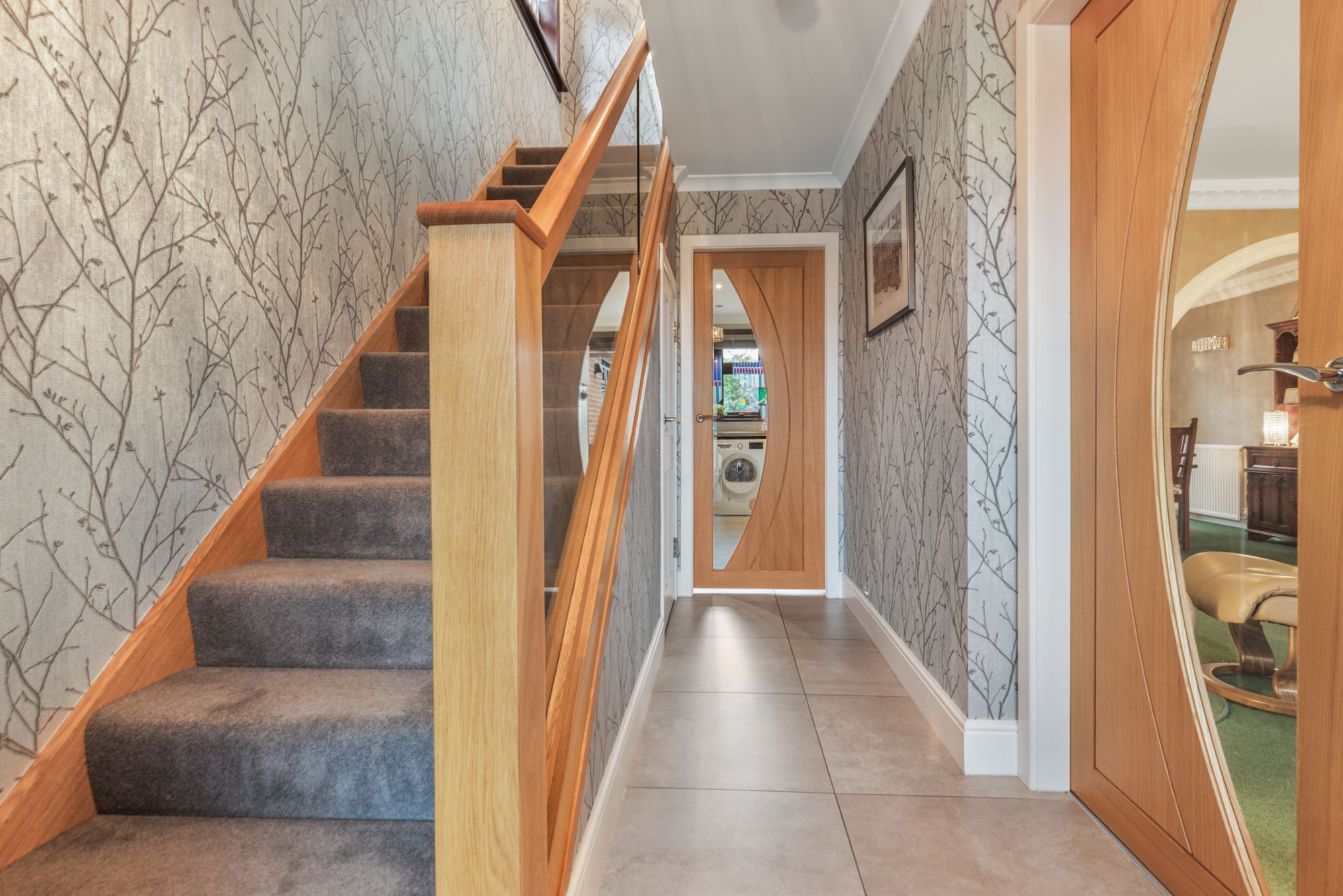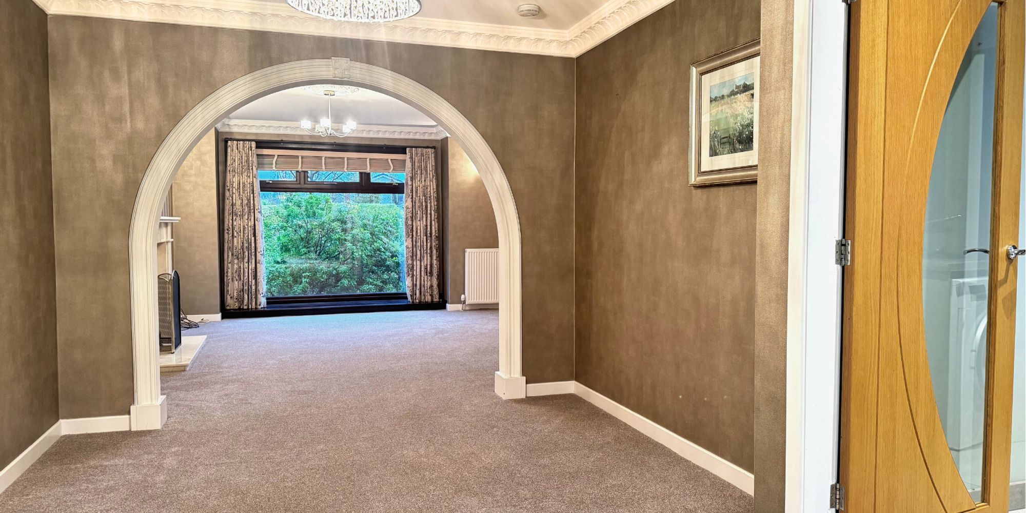 Step through the traditional glass-paned wooden door and into an impressive hallway where porcelain tiles and a glass balustrade with an oak handrail create an immediate sense of sophistication. To the right, double oak doors open to a generous, newly carpeted lounge filled with natural light from a wide picture window. A marble fireplace adds warmth and a welcoming glow, making this the perfect setting for family gatherings or relaxed evenings.