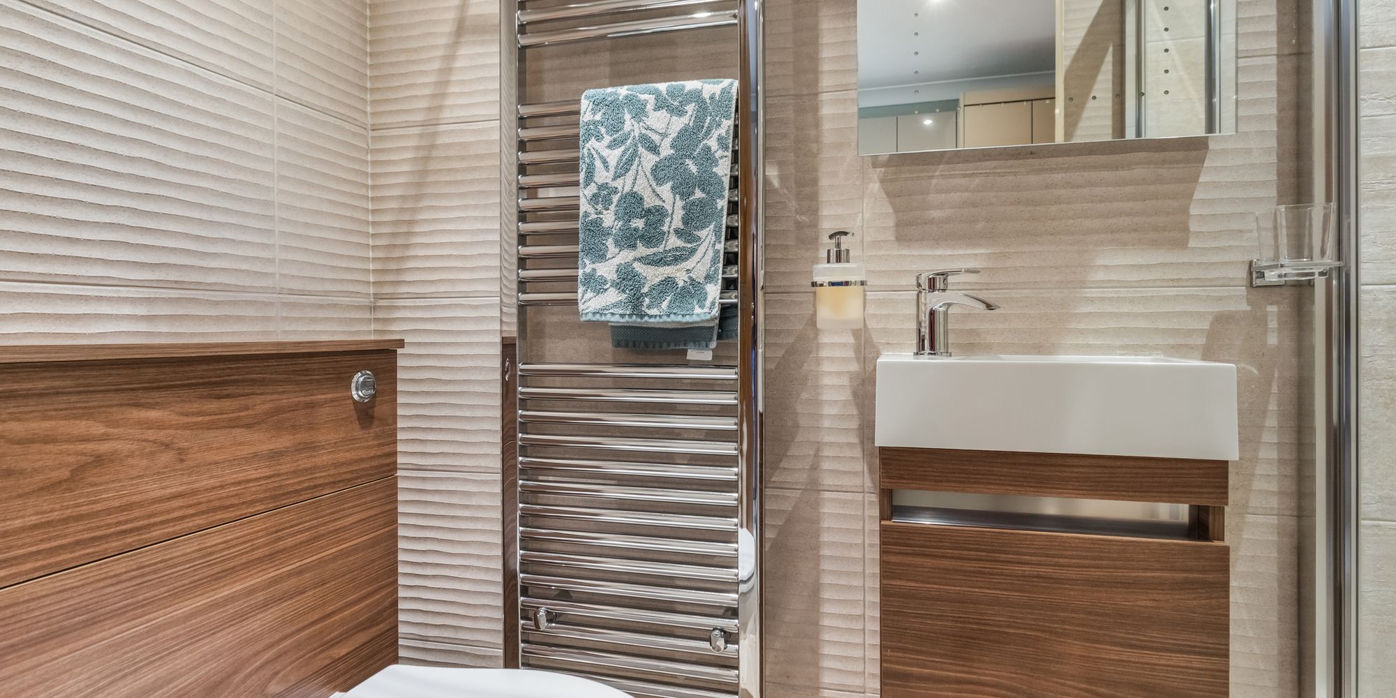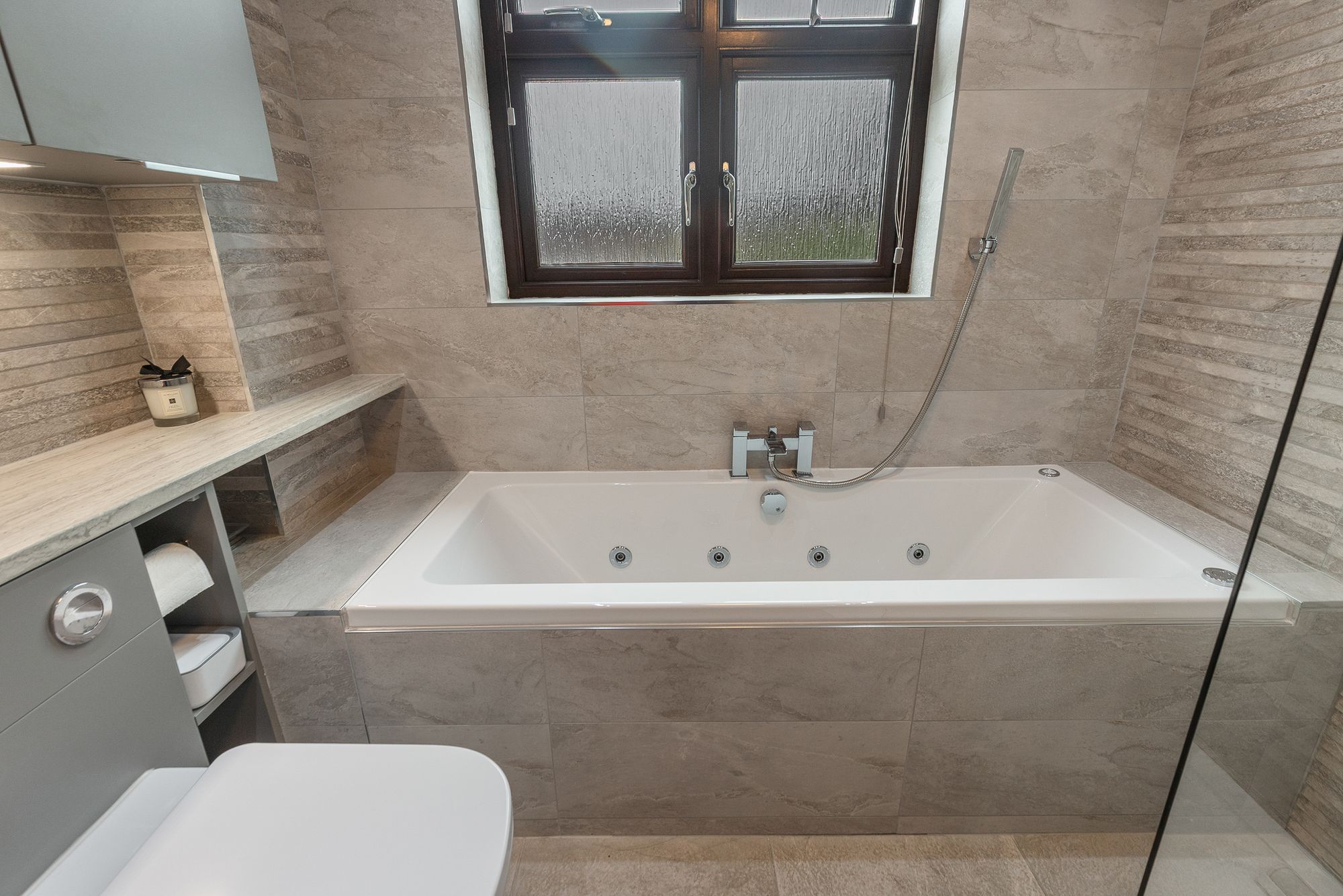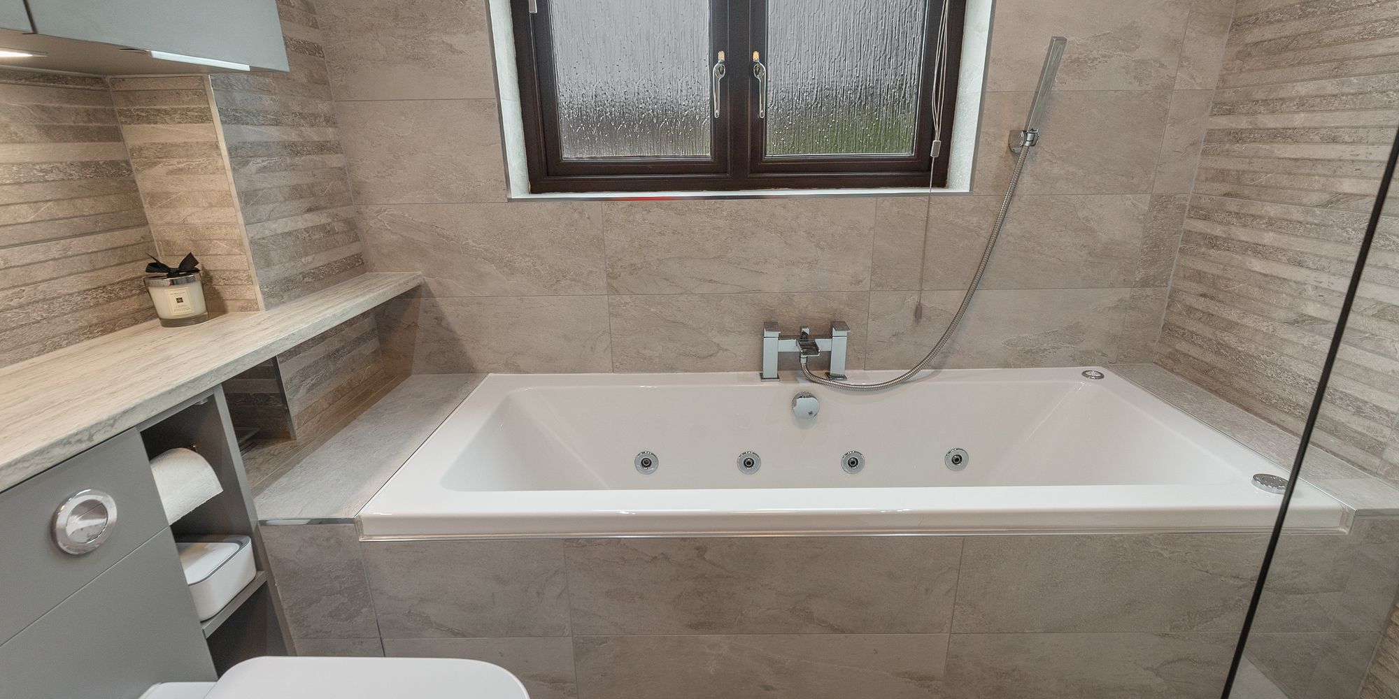 The family bathroom is designed for relaxation and ease, featuring a jacuzzi-style bathtub, sleek fixtures, ample storage, and warm neutral tiling accented with a textured feature wall and soft under-cabinet lighting.