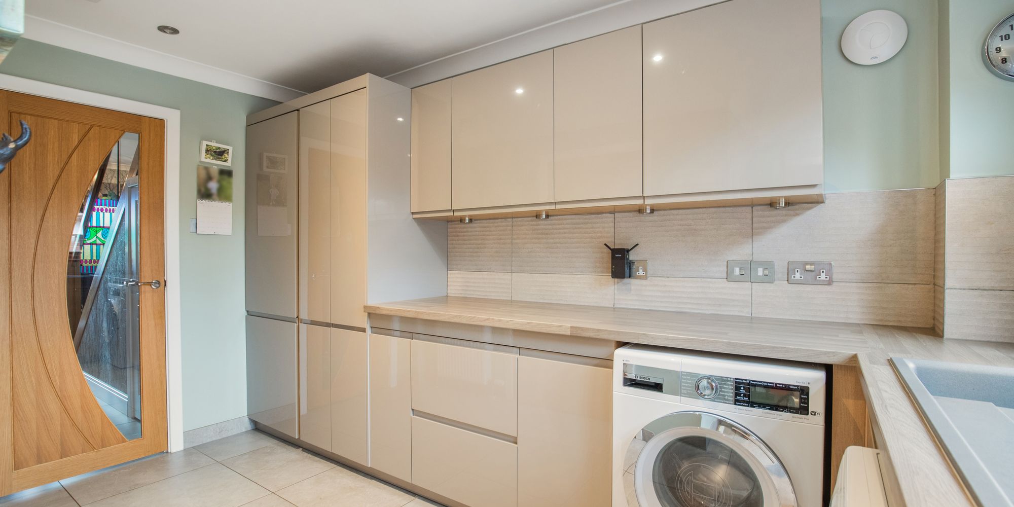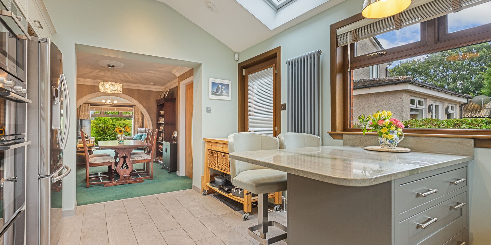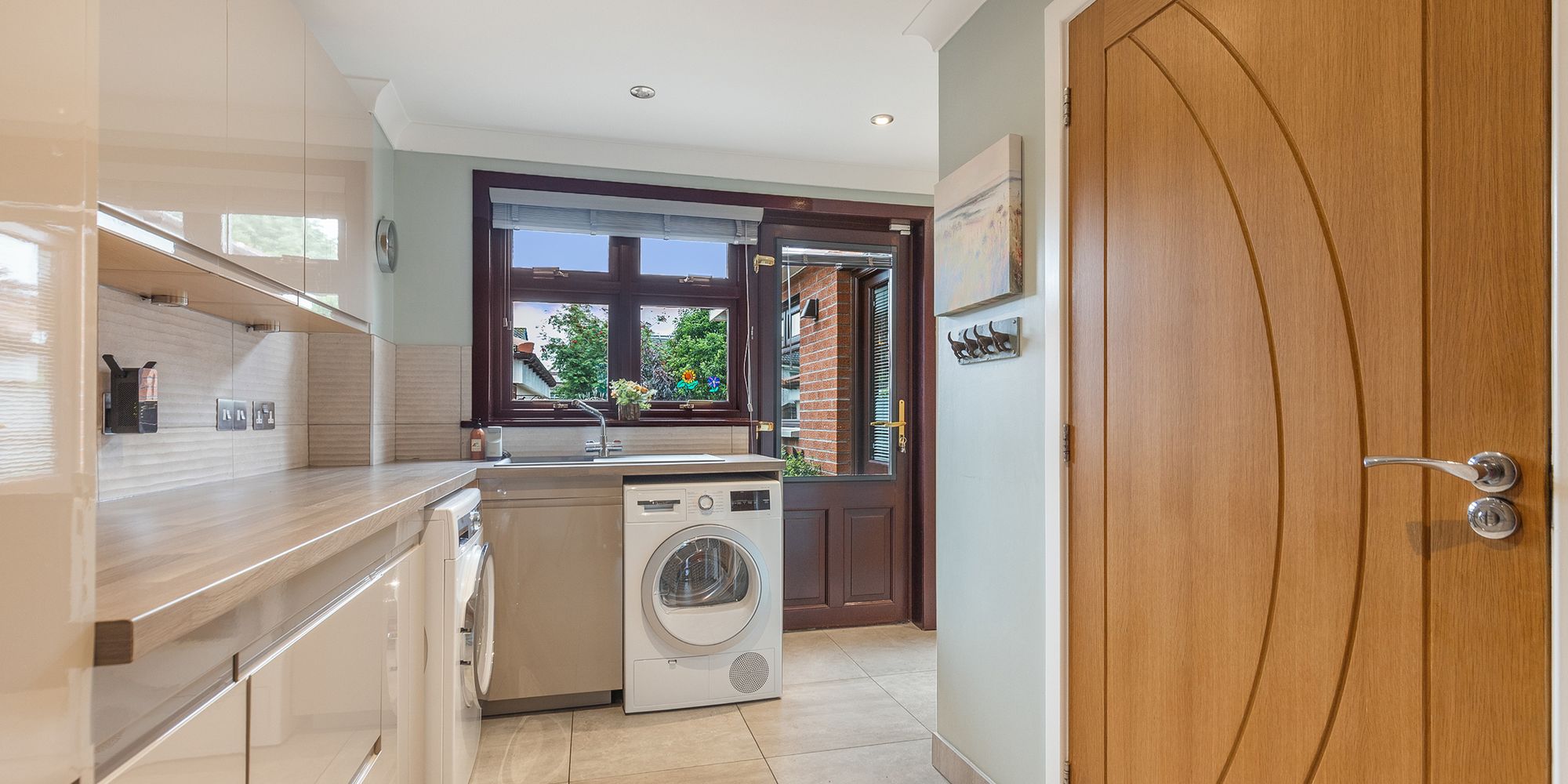 The lounge flows seamlessly through an archway to the dining area, where an intimate yet airy atmosphere makes mealtimes special. Beyond, the modern kitchen combines functionality with charm. Integrated appliances, sleek finishes, and Velux windows create a bright and practical space, complemented by a breakfast peninsula where mornings feel effortless. The adjoining utility room continues the high standard of design with glossy cabinetry, warm wood-effect worktops, and abundant storage.