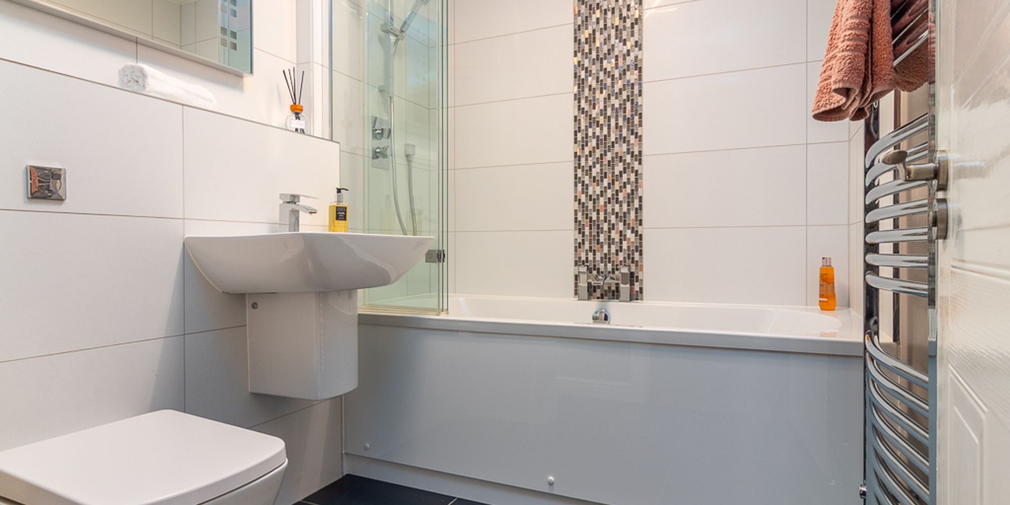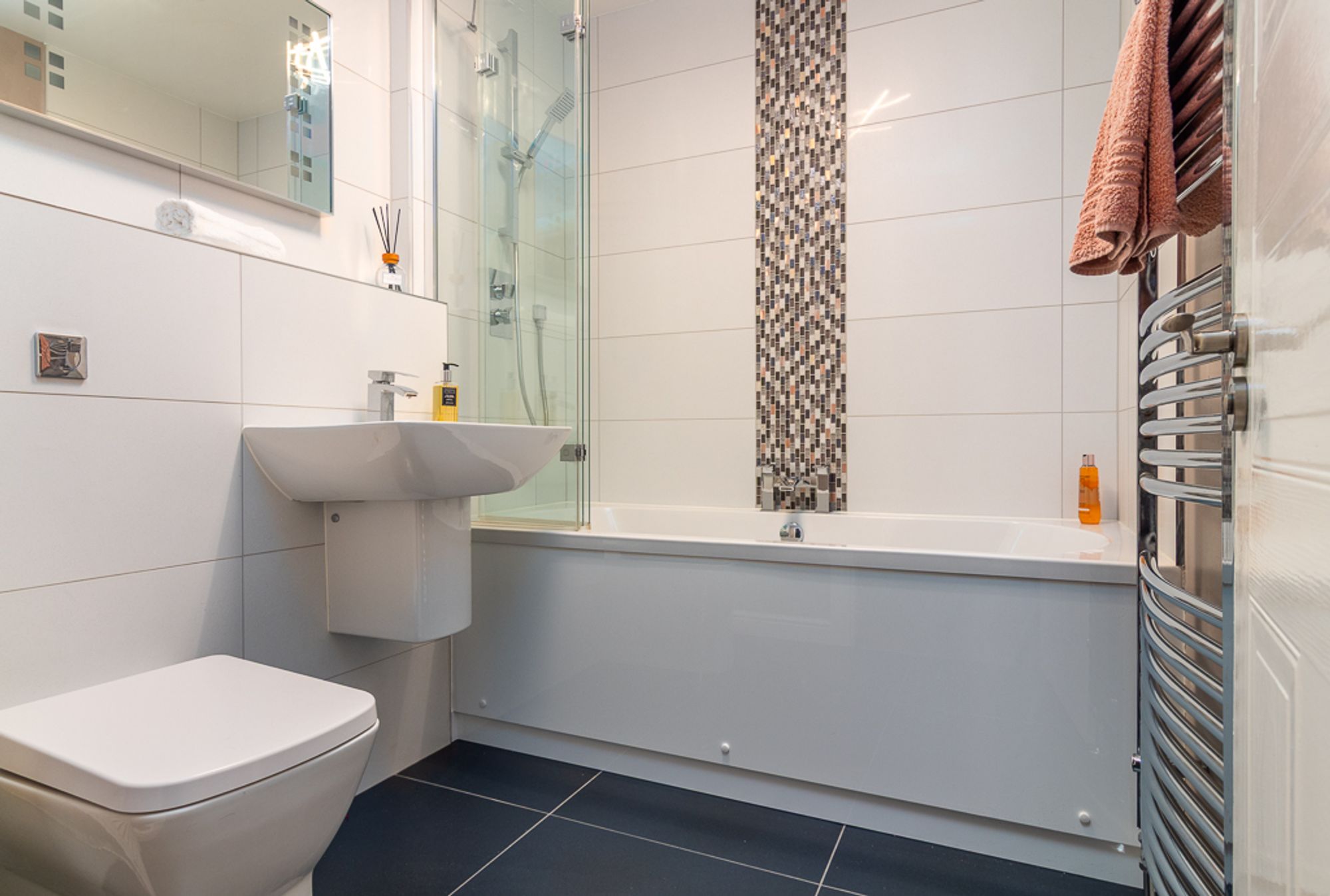 The main bathroom is finished in neutral white tiling and features a three piece suite with a shower over the bath, along with a heated towel rail, providing a bright and practical space for family use.