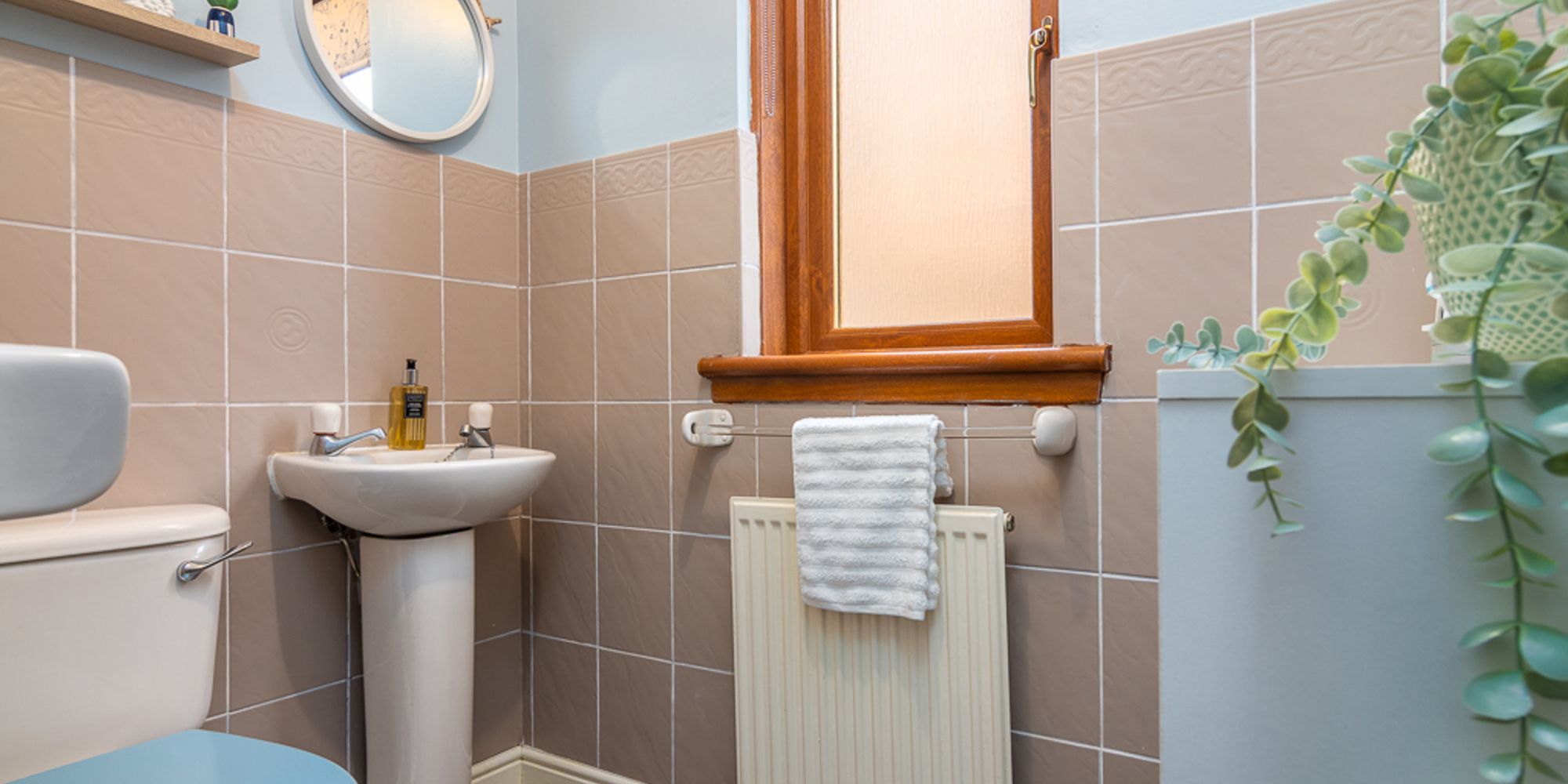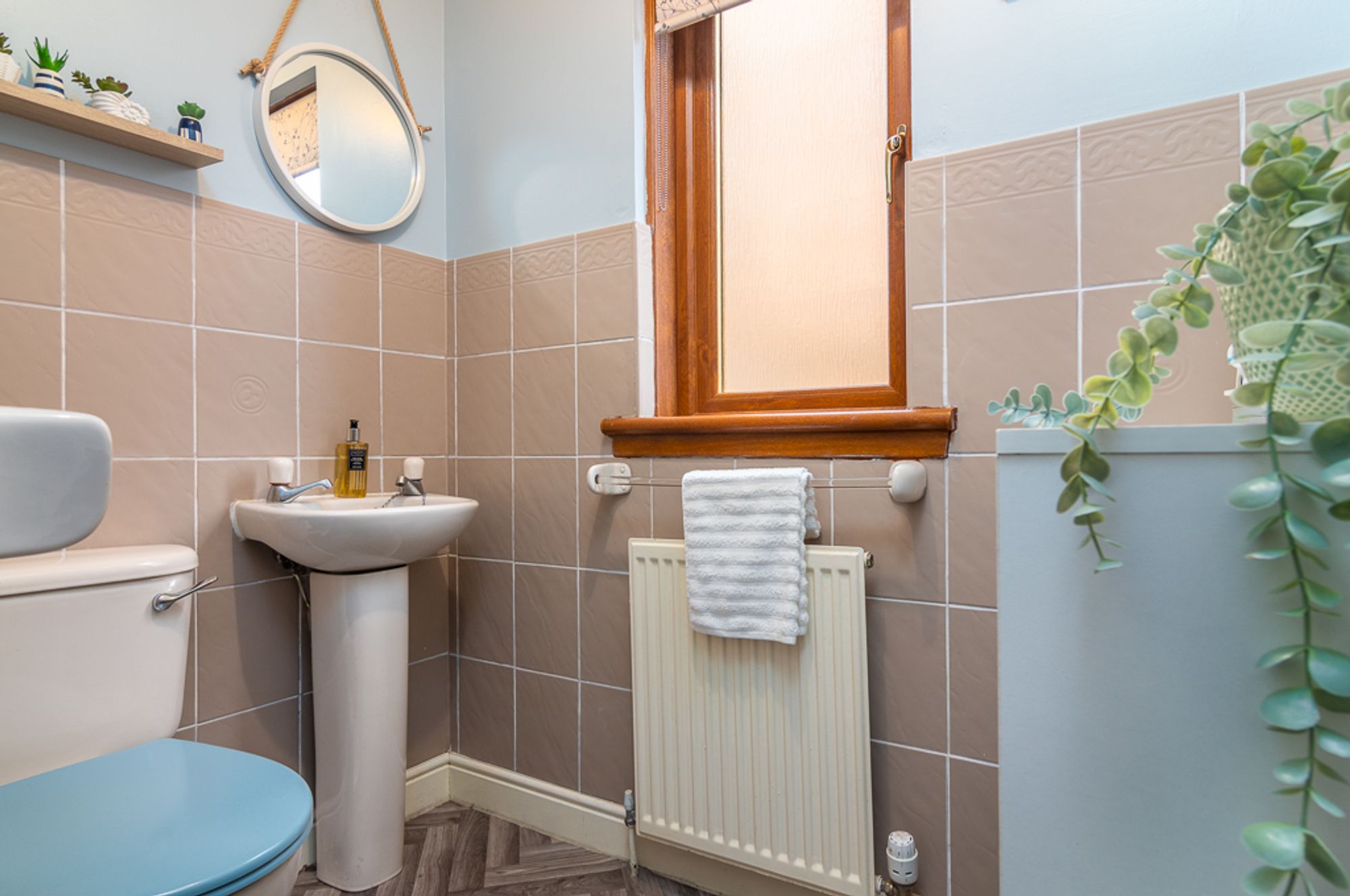 The downstairs WC is located off the hallway and features a wall hung vanity wash hand basin and half tiled walls, making it a practical addition for guests. A cupboard within the WC provides useful storage for spare towels and toiletries.