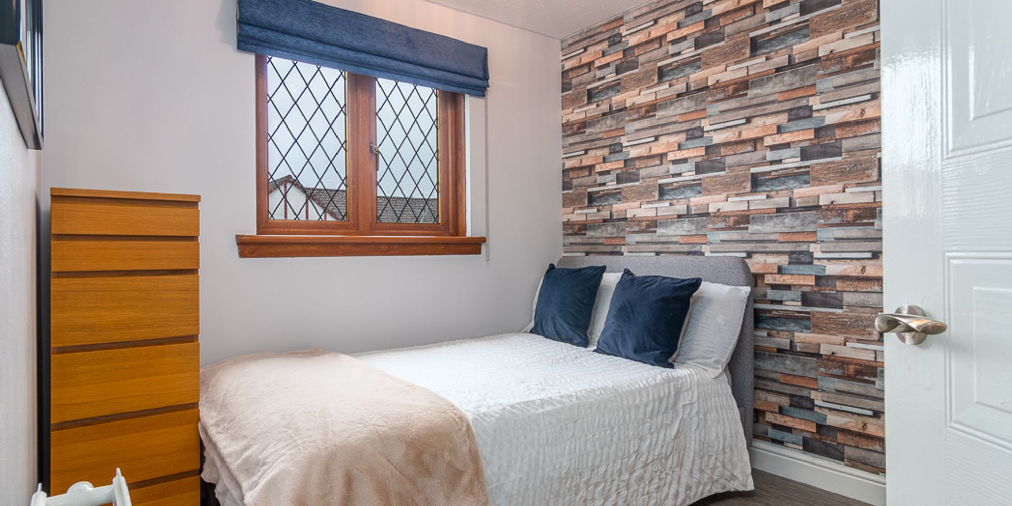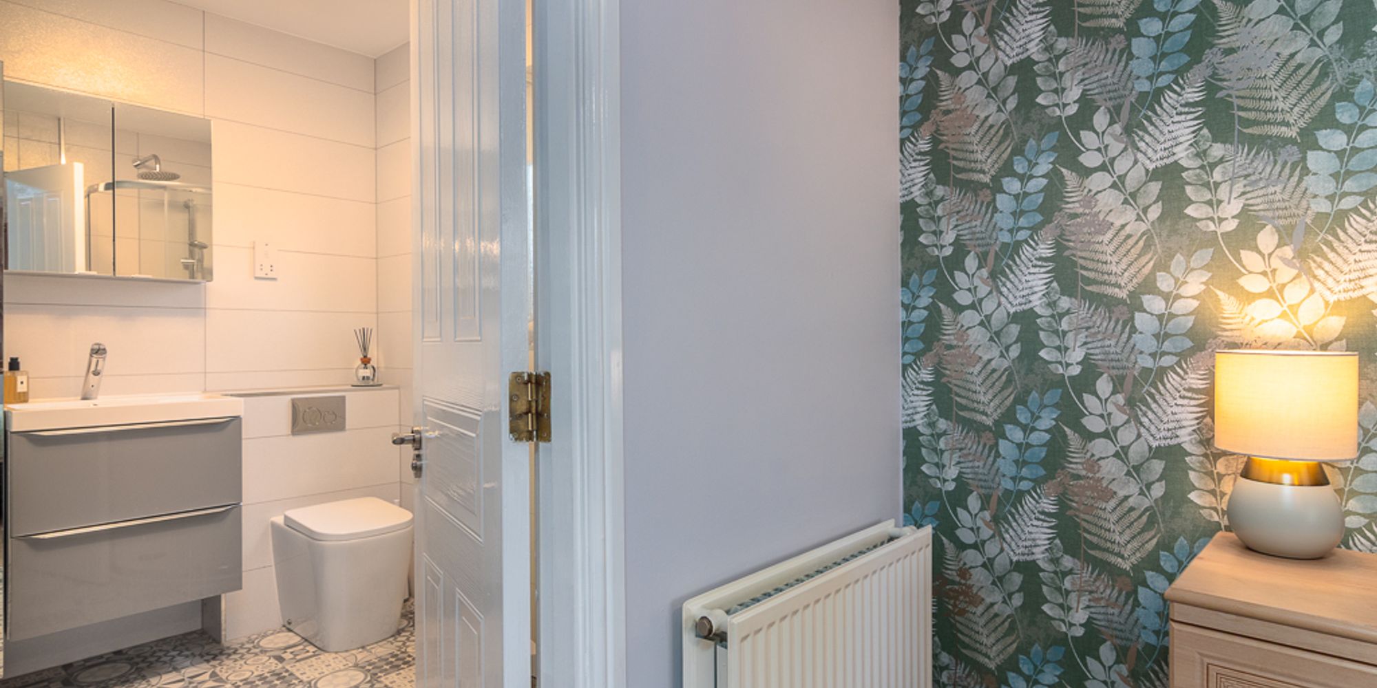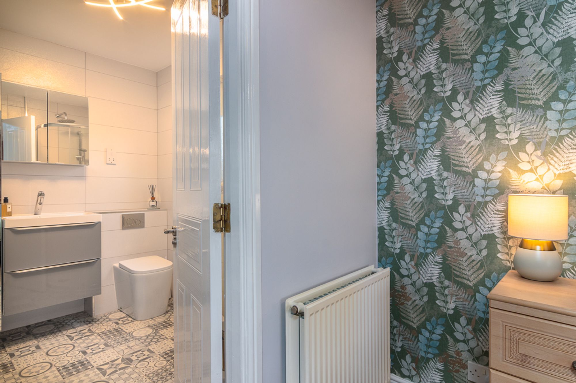 Before turning in for the night, the contemporary ensuite offers a spa like experience. Finished with sleek gloss grey furniture and fresh white tiling, it features a walk in shower complete with a rainfall shower head and handheld sprayer. Underfloor heating adds an extra touch of comfort, while fluffy towels can be warmed on the heated towel rail, making everyday routines feel that little bit more indulgent.