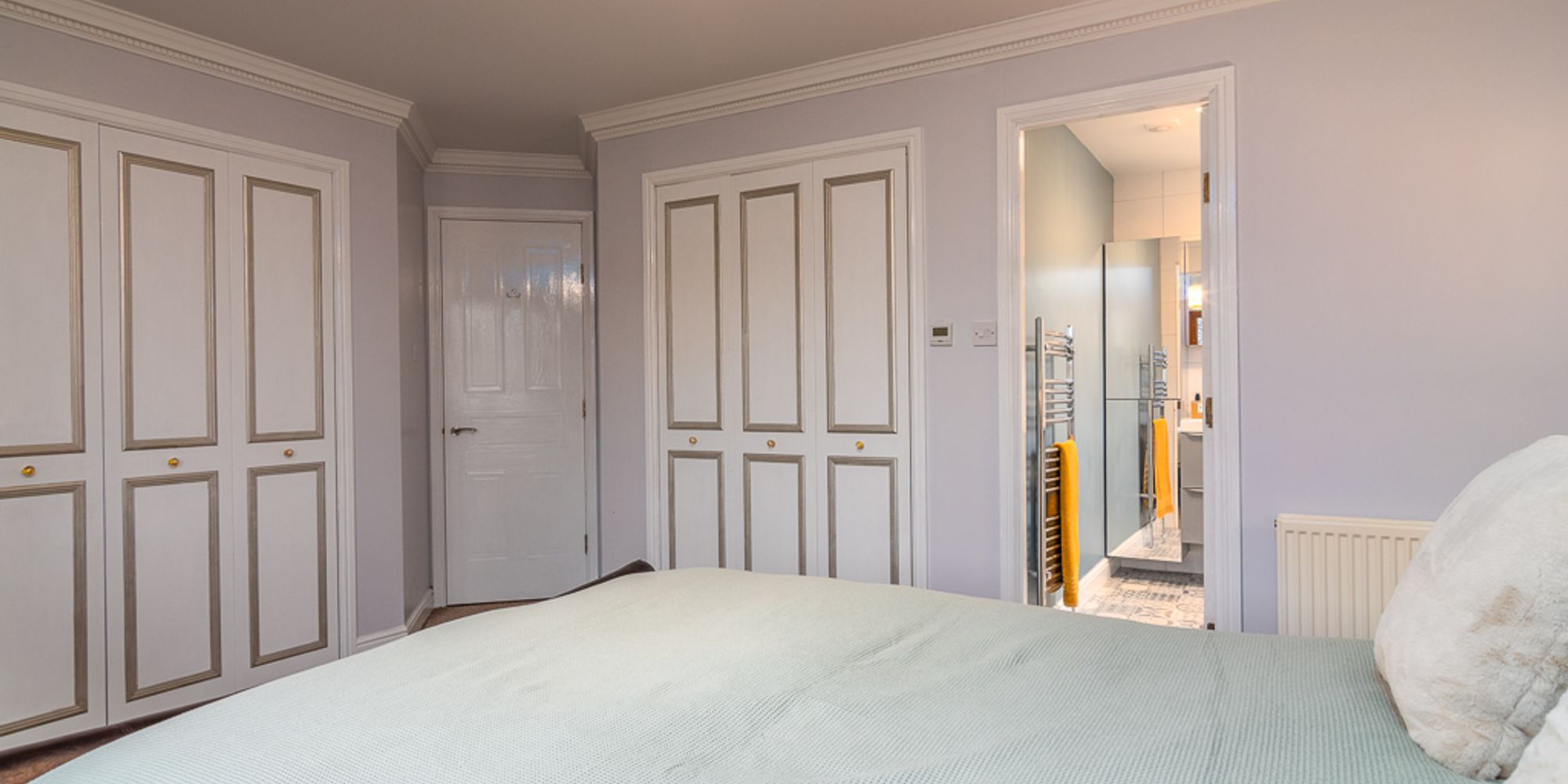 Upstairs, the principal bedroom is a generous and calming retreat, perfect for switching off at the end of a busy day. Decorated in soft green and beige tones, it feels immediately restful, with ample fitted storage to keep clothing and belongings neatly tucked away. There is plenty of space for a super king bed, creating a true sanctuary to relax and recharge in.