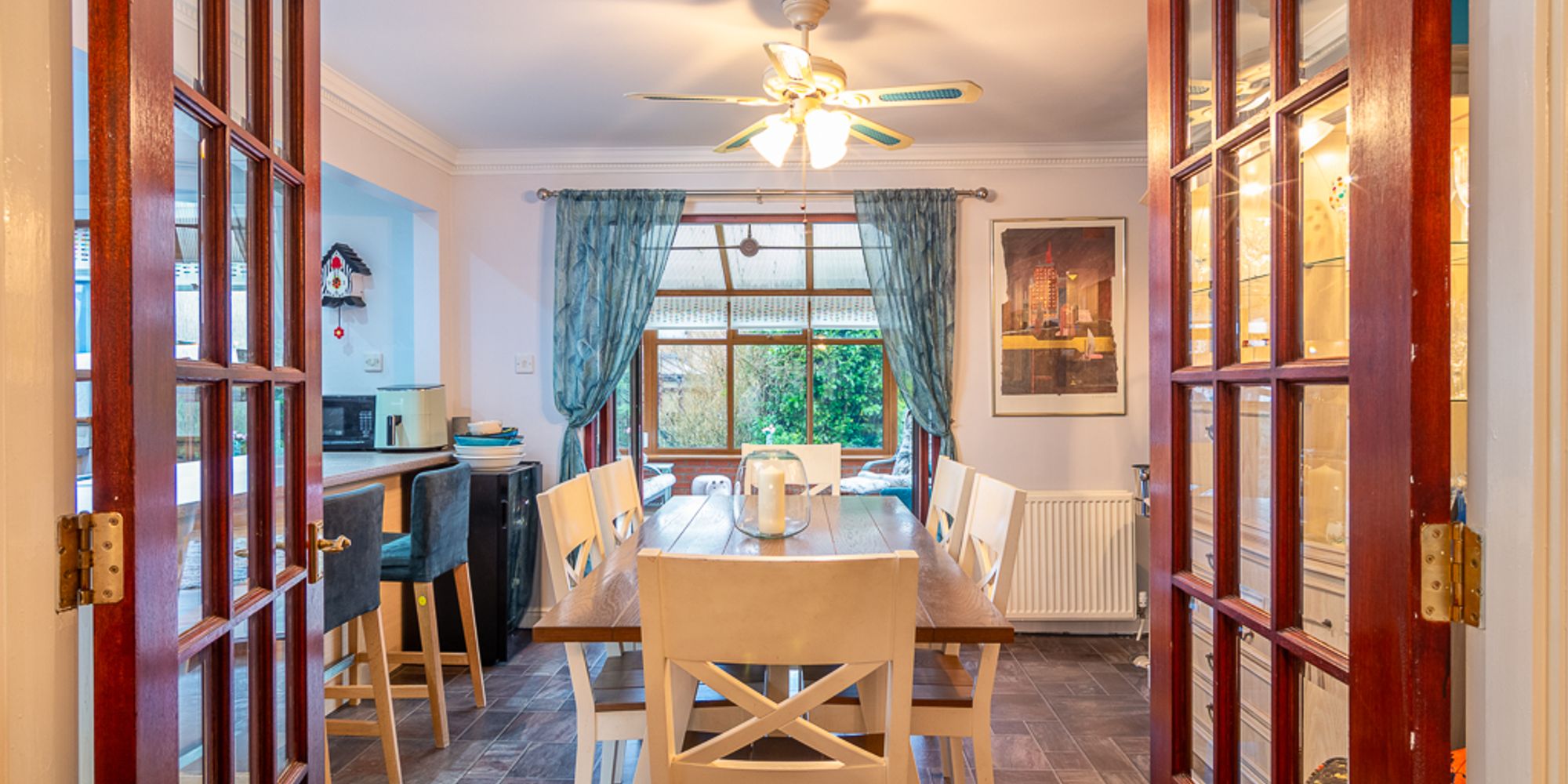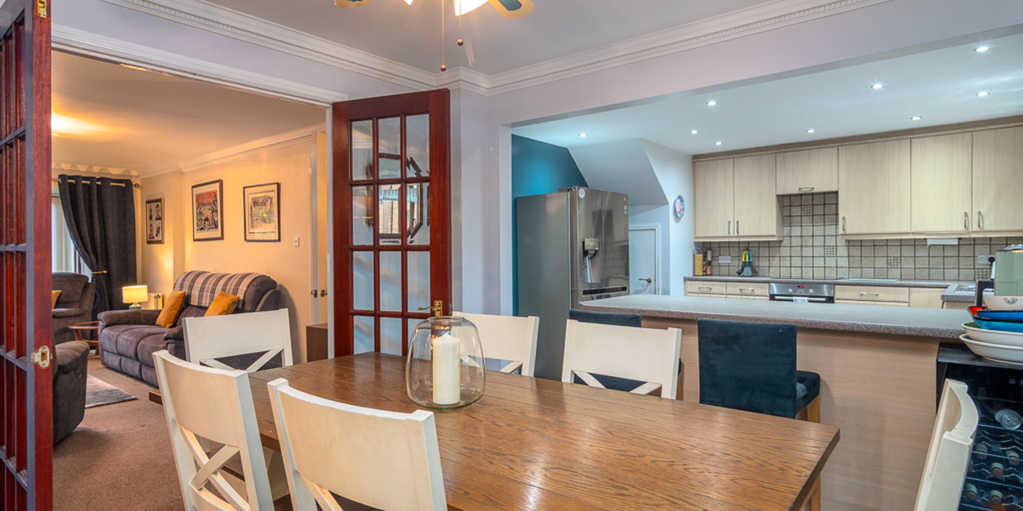 The kitchen is designed with both everyday life and entertaining in mind. A good mix of beech toned wall and base units provides ample storage, complemented by integrated appliances including hob, oven and extractor fan, with the hob and extractor recently replaced. The dishwasher will also be included in the sale. A window above the sink looks out over the rear garden, and a door leads directly outside, perfect for summer days when children are in and out or when dining outdoors. The large peninsula creates generous worktop space and quickly becomes a favourite spot for casual breakfasts, morning coffees or relaxed meals while chatting with family. A spacious cupboard beneath the stairs offers excellent storage for larger household appliances, keeping the kitchen clutter free. Just off the kitchen, there is plenty of room for a six seater dining table, ideal for family dinners, birthdays and hosting guests.
