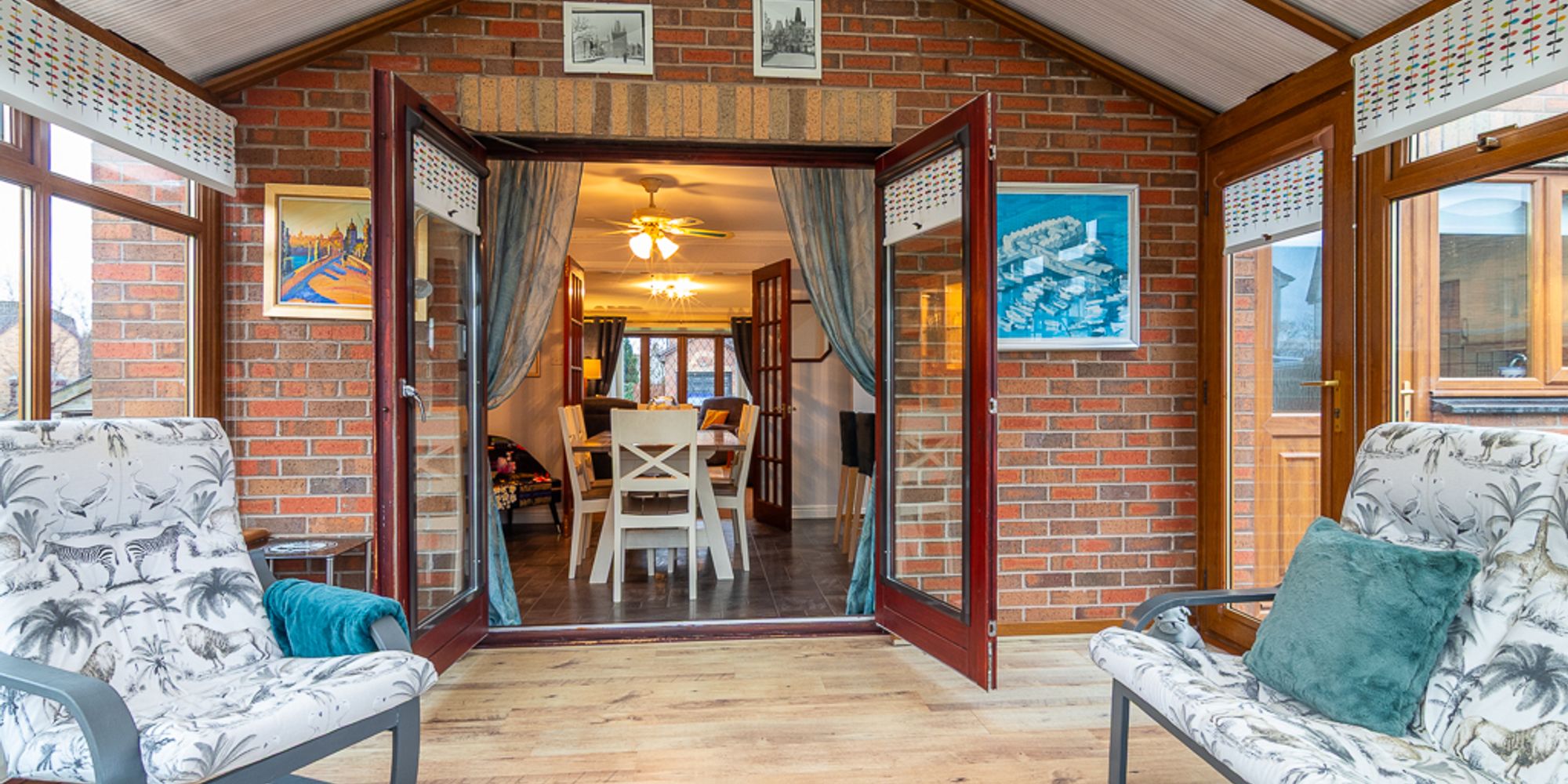 The lounge is a warm and inviting space to unwind, with a large box bay window drawing in plenty of natural light. Soft carpeting and welcoming blue tones create a comfortable setting for evenings on the sofa, while glazed double doors lead through to the open plan dining room and kitchen. This thoughtful layout allows light to flow right through from the conservatory, making it ideal for socialising with friends and family, yet the doors can be closed when you want to settle in and enjoy a cosy night in.