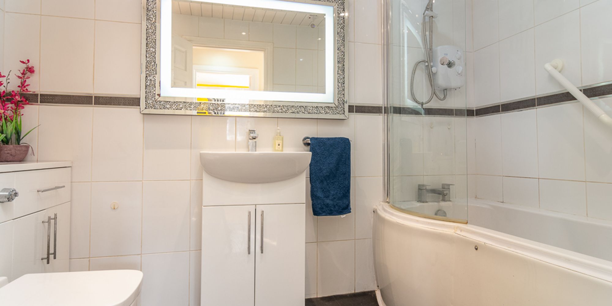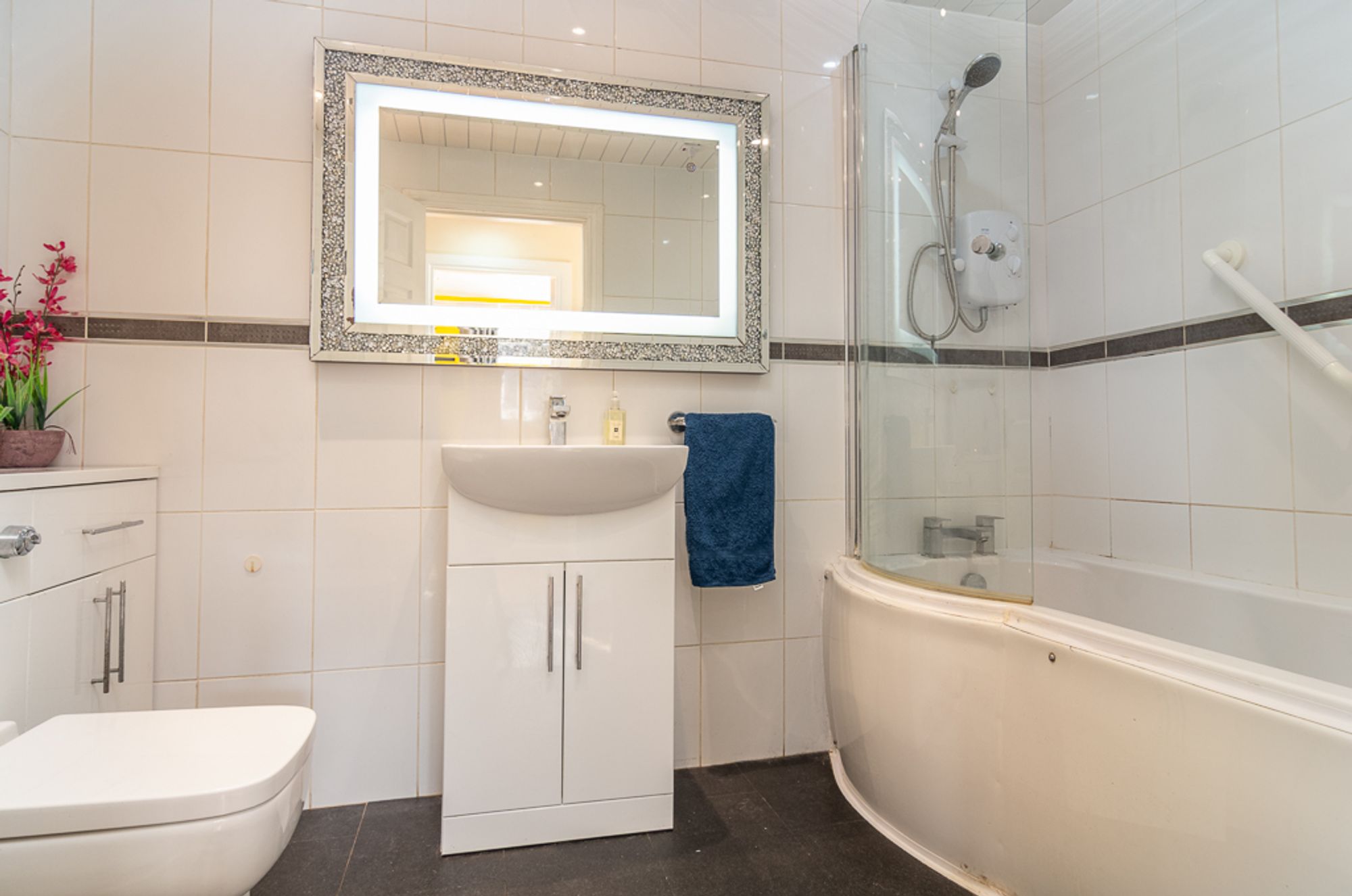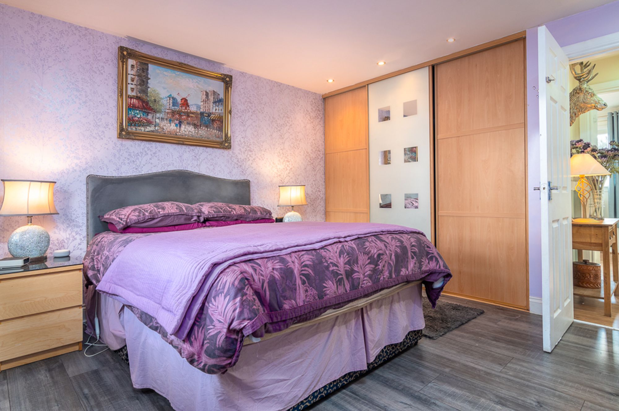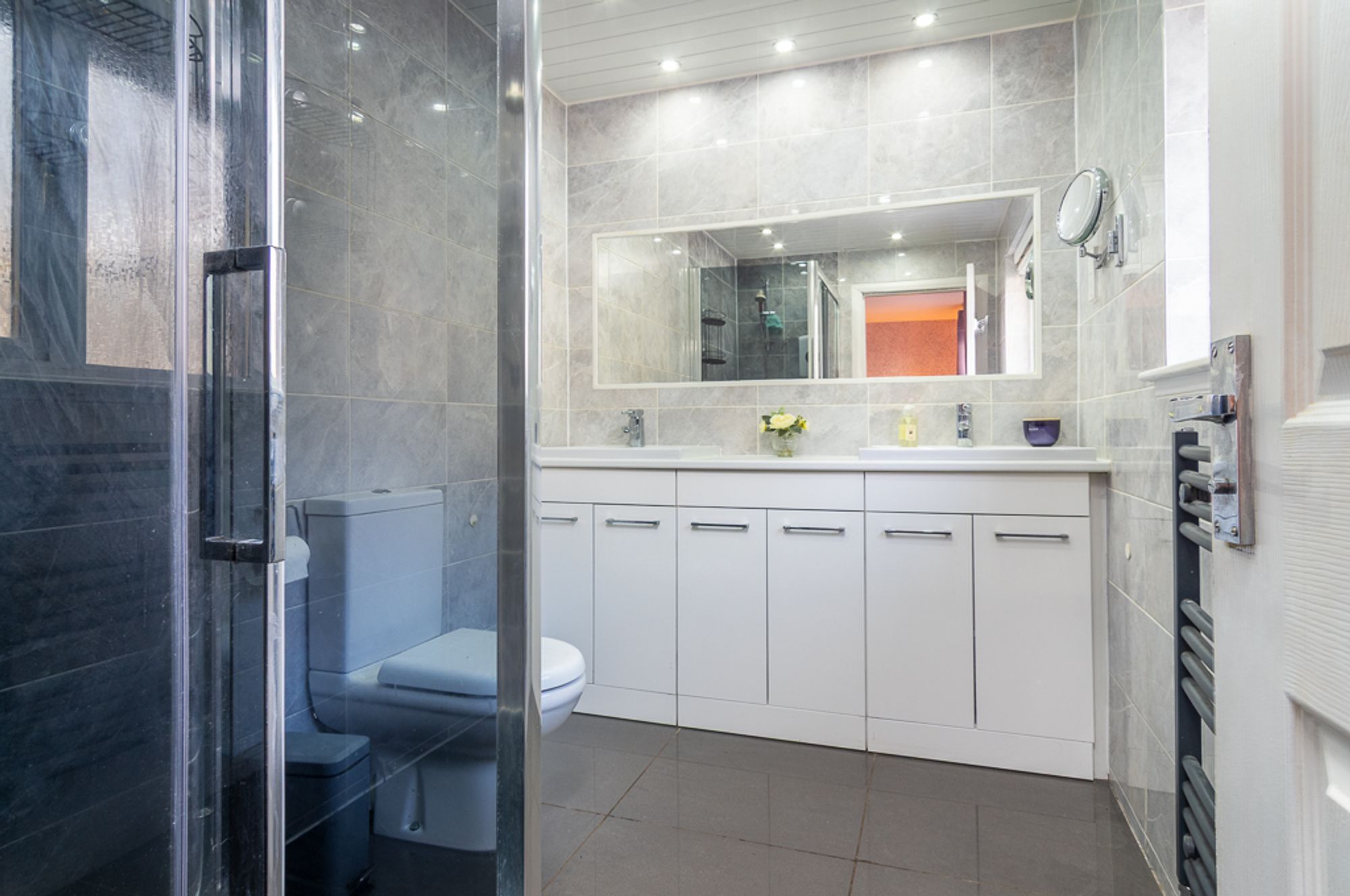 The bedrooms reflect the scale and comfort of the home. The principal bedroom features double built-in wardrobes and a luxurious en-suite with a walk-in shower, twin vanity basins, illuminated mirror, heated towel rail, and contemporary finishes in soft grey tones. Three further bedrooms provide flexibility for children, guests, or study space, with two offering built-in storage. A fully tiled family bathroom with a bath and overhead shower serves the remaining bedrooms.