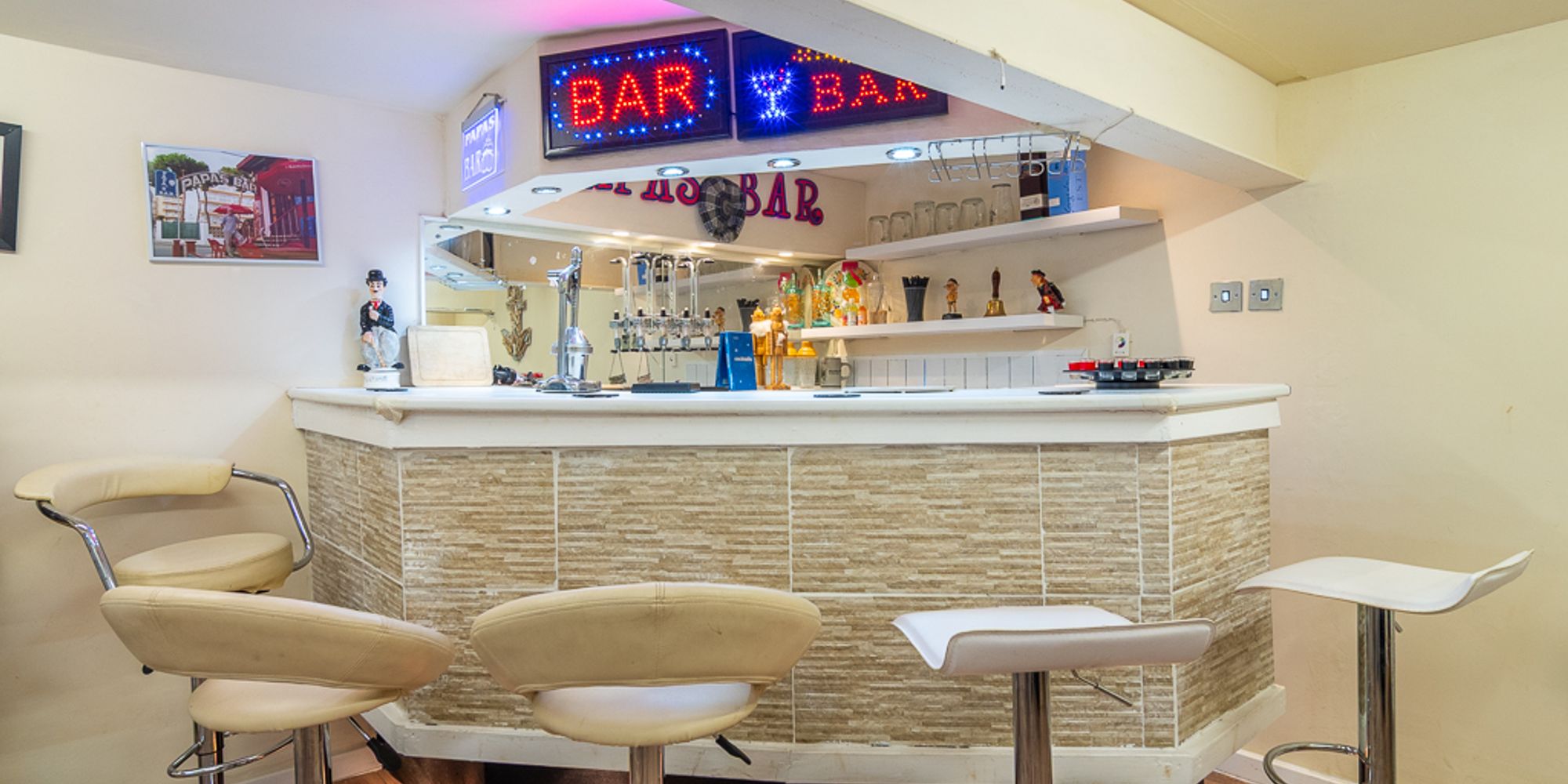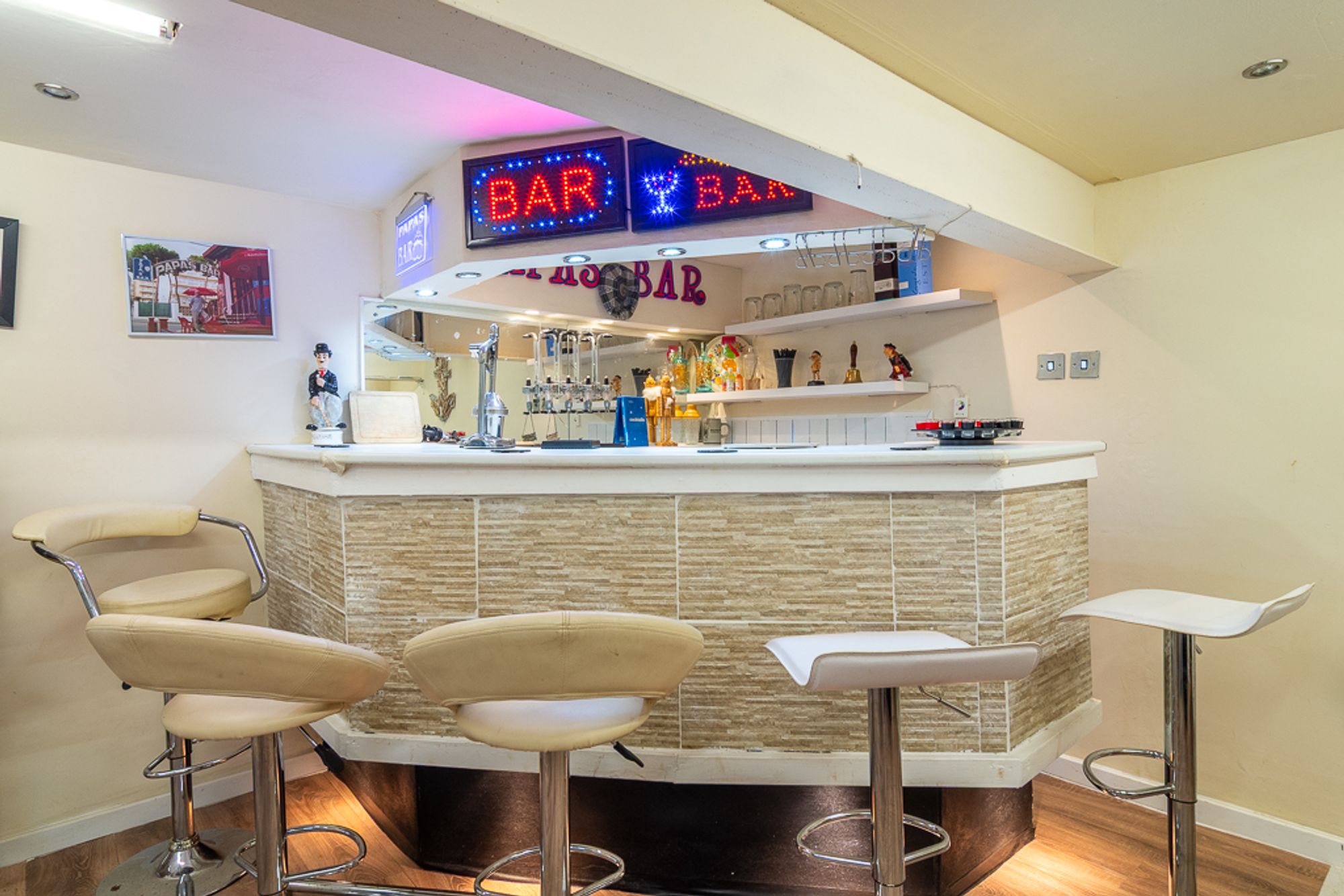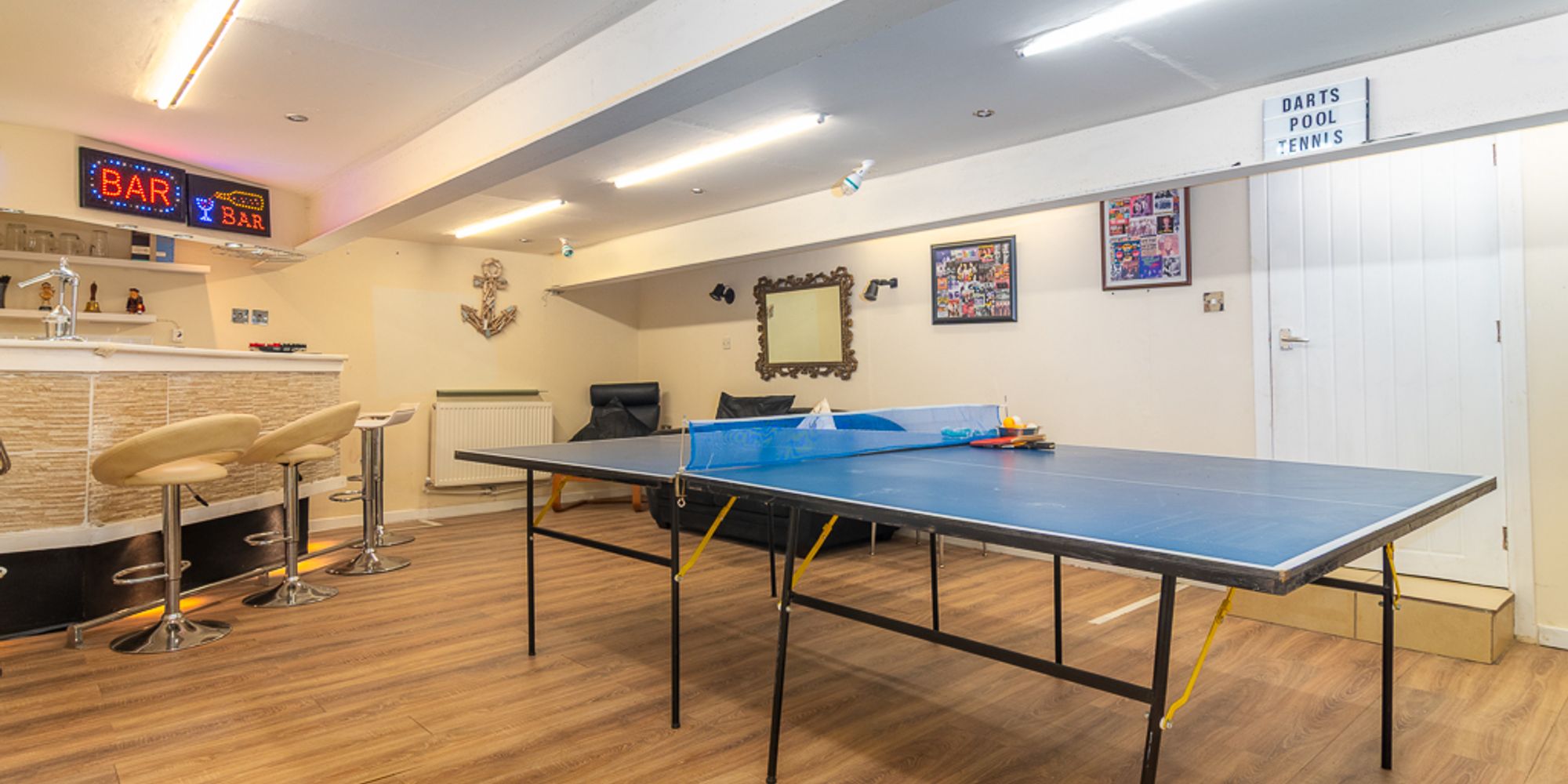 A standout feature for families with older children is the substantial lower level, accessed via an internal staircase from the main hallway. This floor significantly extends the living space, offering independence and separation from the main accommodation above. The large double garage leads into a dedicated games and entertainment room, complete with a built-in under-lit bar and plenty of space for a pool or table tennis table. This area is perfect as a teenage retreat, social space, or hobby room.