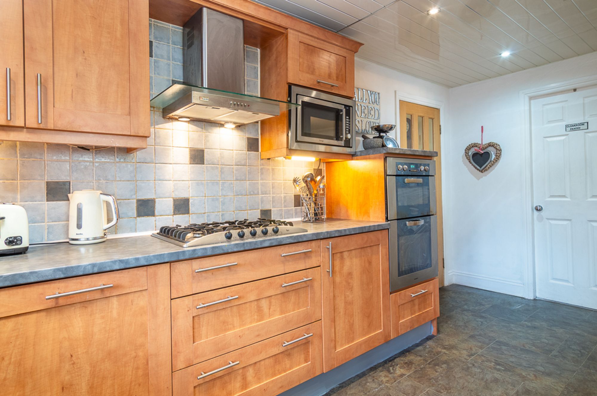 At the heart of the home, the kitchen is designed for everyday family living. Featuring rich cherry wood cabinetry, dark worktops, integrated double ovens, a microwave, and a five-point hob, it offers ample storage and space for a round table for informal meals. A separate pantry adds practicality, with the option to use it as a coat room.