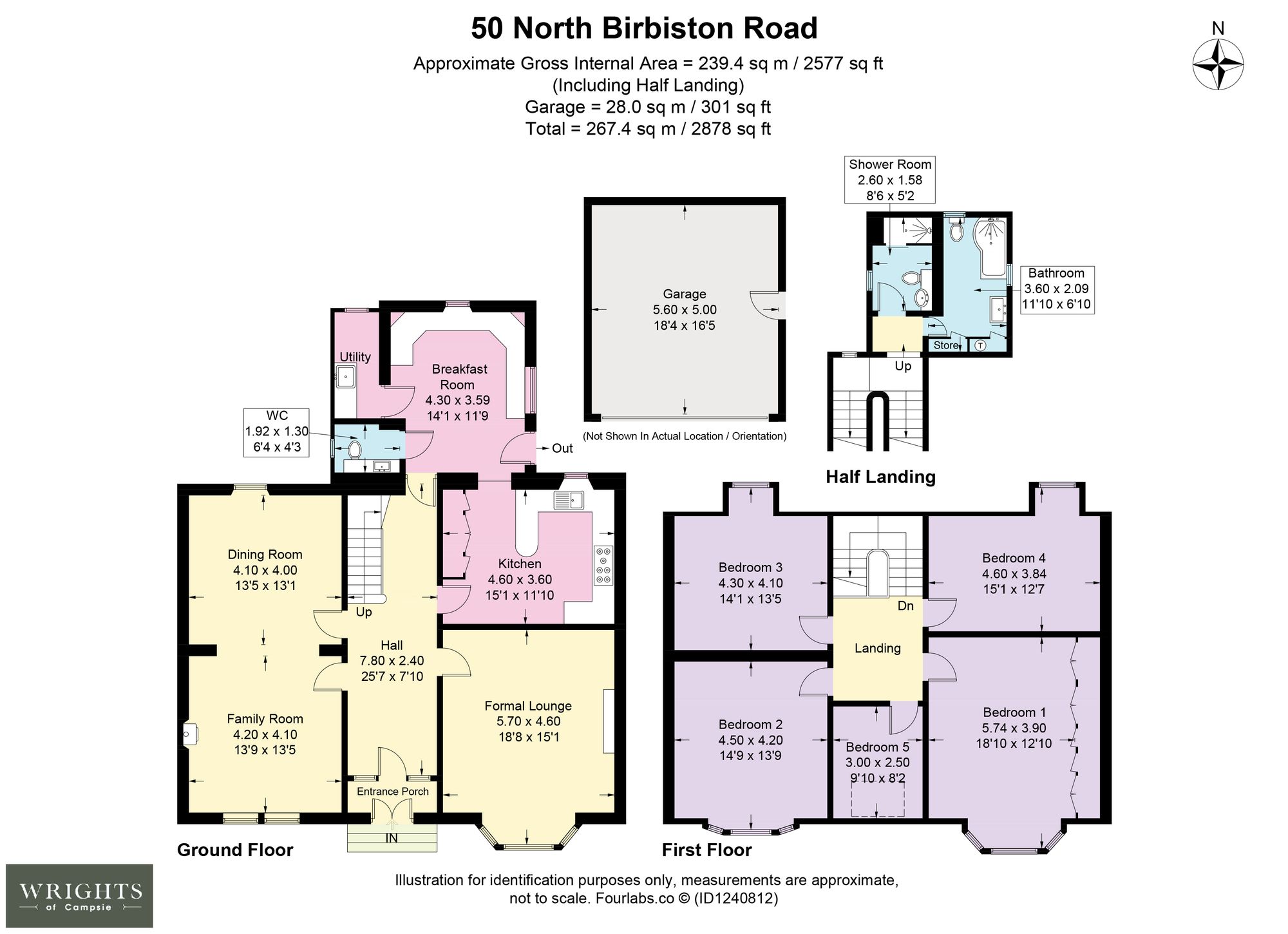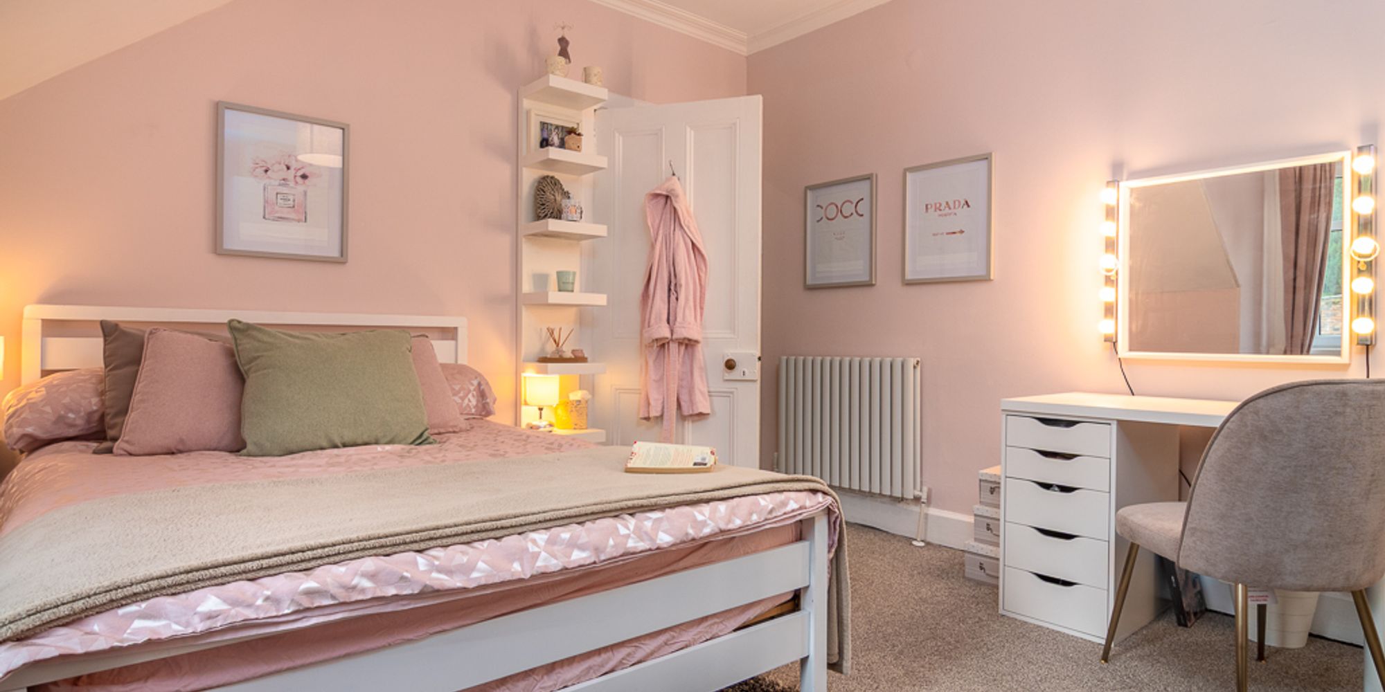 Upstairs, the accommodation is generous and well-planned. Four large double bedrooms and one single offer flexibility for family life, with each finished in high-quality décor and plush carpeting. The main bedroom features sleek fitted wardrobes by Sharps, a bay window, and a stylish panelled headboard with sockets and wall sconces for reading. Bedroom three has a bespoke fitted unit with wardrobes, shelving, and a built-in TV space, while the single bedroom serves as a bright home office beneath a expansive skylight. On the half-landing, the family bathroom with walk-in storage and a separate shower room are both finished in neutral tones.