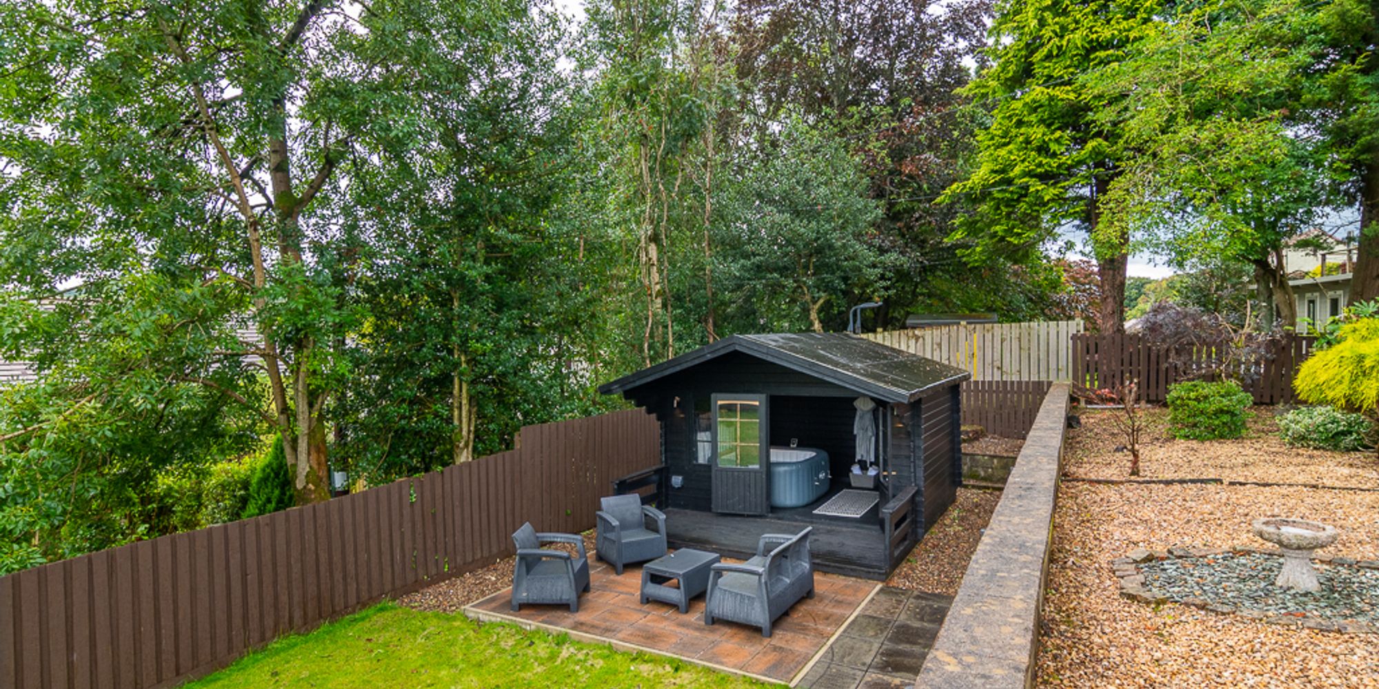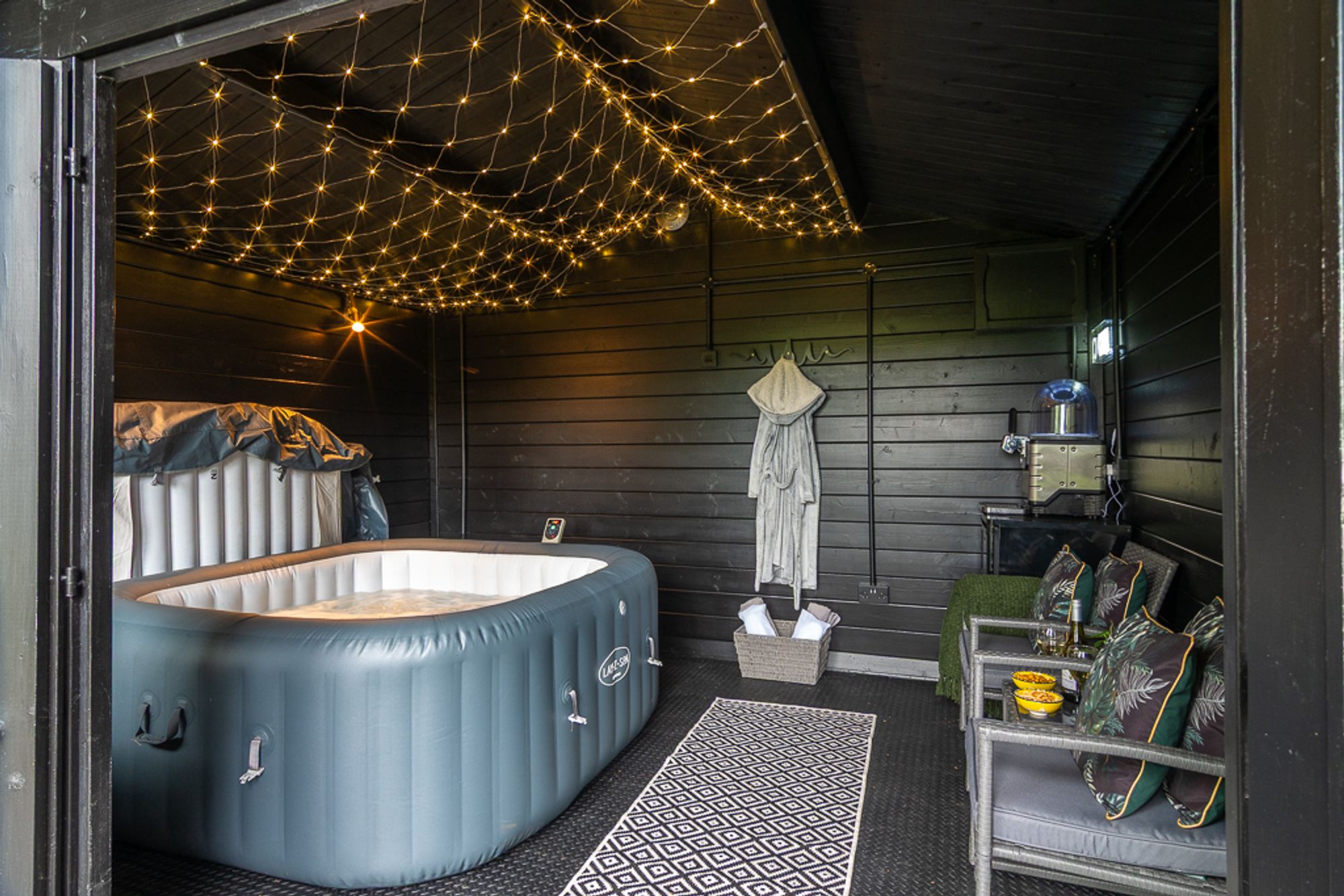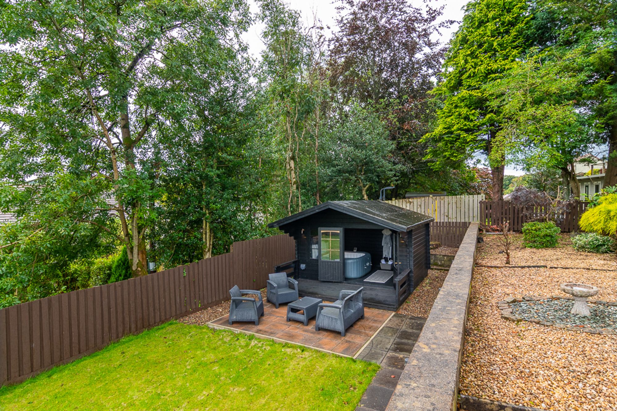 The gardens extend the living space outdoors and have been designed with relaxation in mind. At the front, a lush, level lawn leads to a summer house that has been transformed into a spa retreat, complete with hot tub. Set beneath twinkling fairy lights, it is the perfect spot to unwind on a chilly evening, cosy behind French doors with a glass in hand. A paved path curves around the property, where a black timber door opens into the basement that is ideal for garden storage. Further along, three seating areas are perfectly positioned to catch the sun at different times of day, while illuminated borders and pathways bring a soft glow after dark. At the rear, a gate provides access to on-street parking, while at the front off the driveway, the double garage with power and up-and-over door adds further practicality.