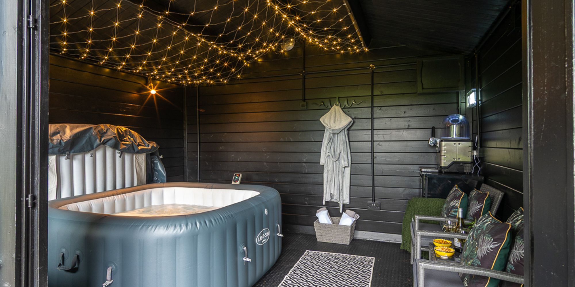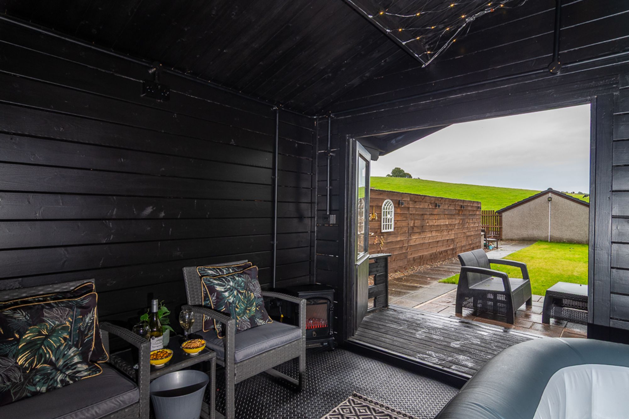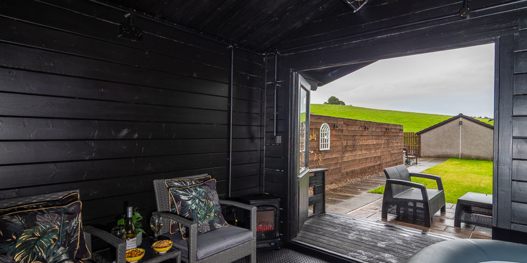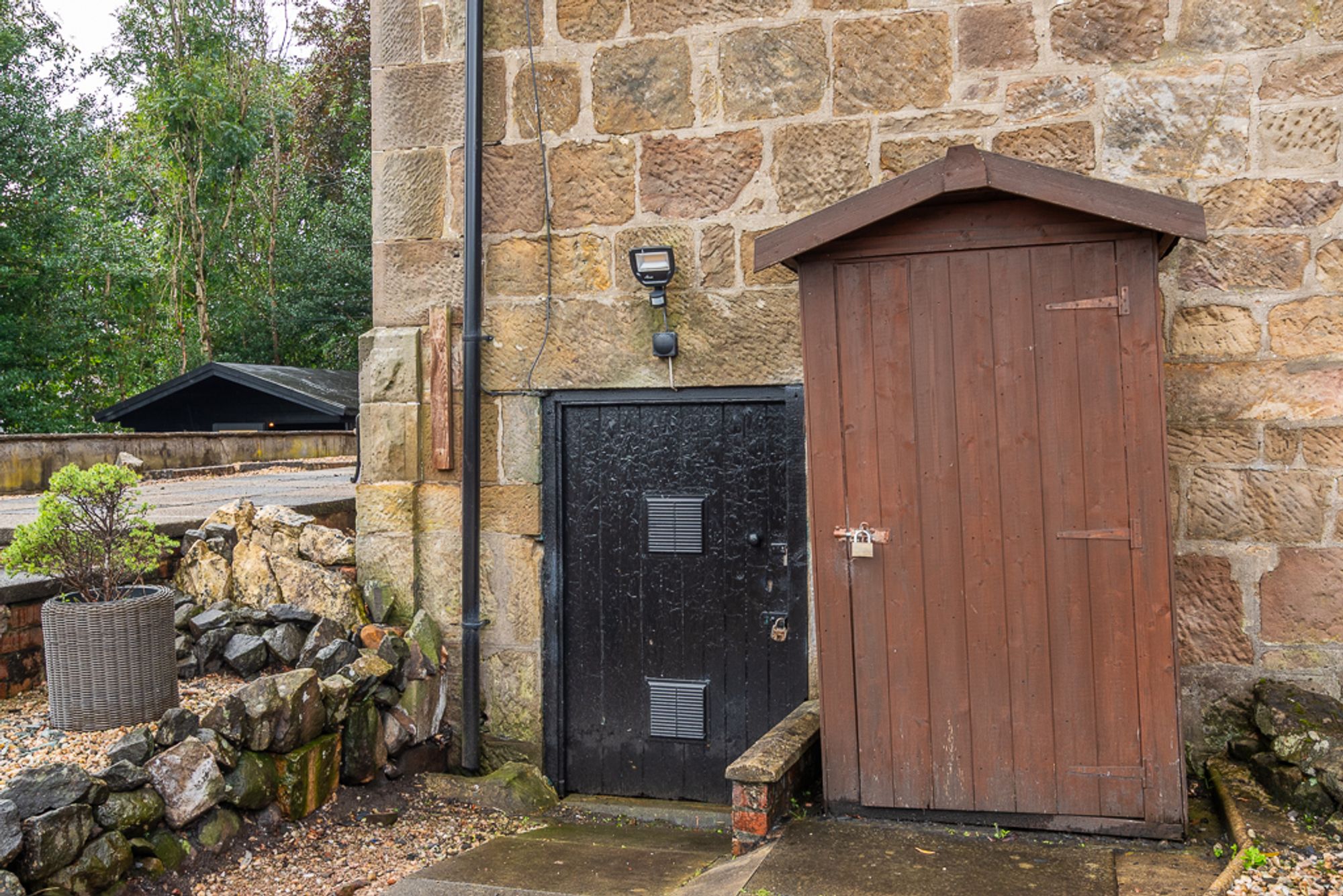 The gardens extend the living space outdoors and have been designed with relaxation in mind. At the front, a lush, level lawn leads to a summer house that has been transformed into a spa retreat, complete with hot tub. Set beneath twinkling fairy lights, it is the perfect spot to unwind on a chilly evening, cosy behind French doors with a glass in hand. A paved path curves around the property, where a black timber door opens into the basement that is ideal for garden storage. Further along, three seating areas are perfectly positioned to catch the sun at different times of day, while illuminated borders and pathways bring a soft glow after dark. At the rear, a gate provides access to on-street parking, while at the front off the driveway, the double garage with power and up-and-over door adds further practicality.