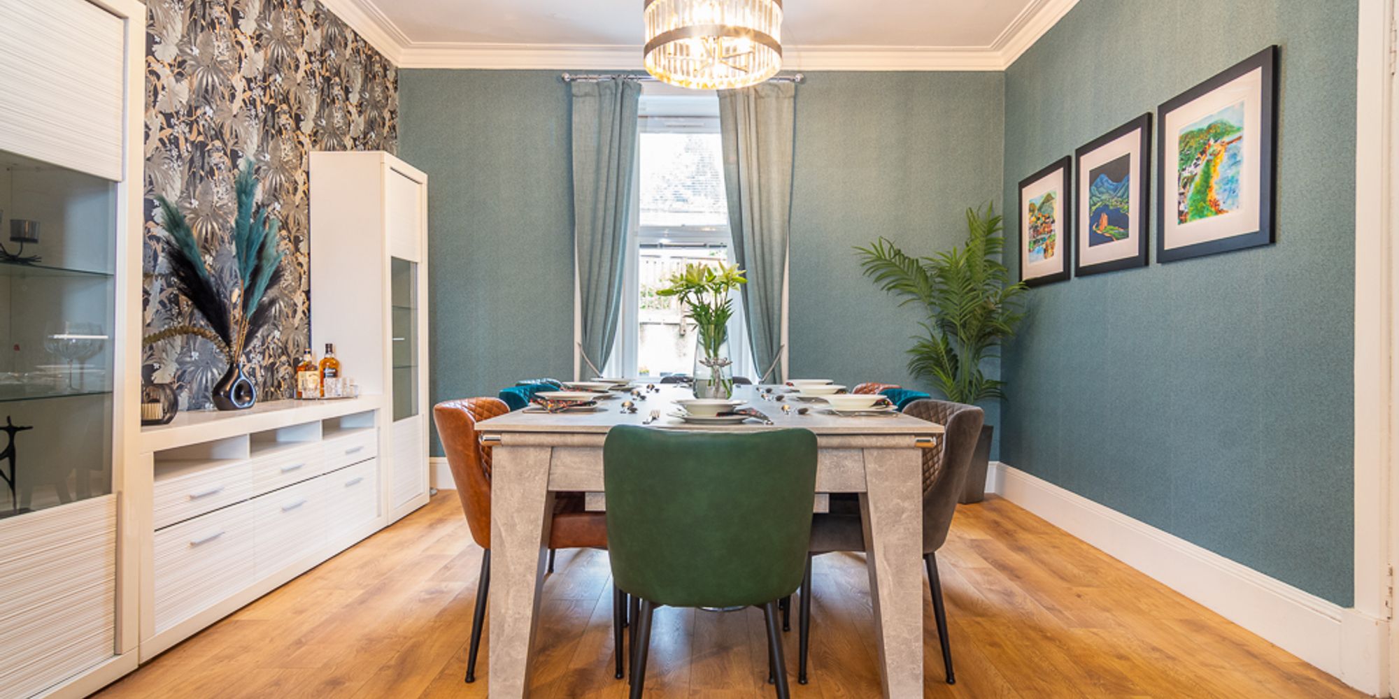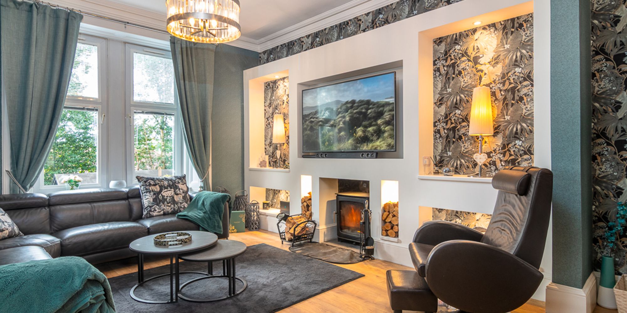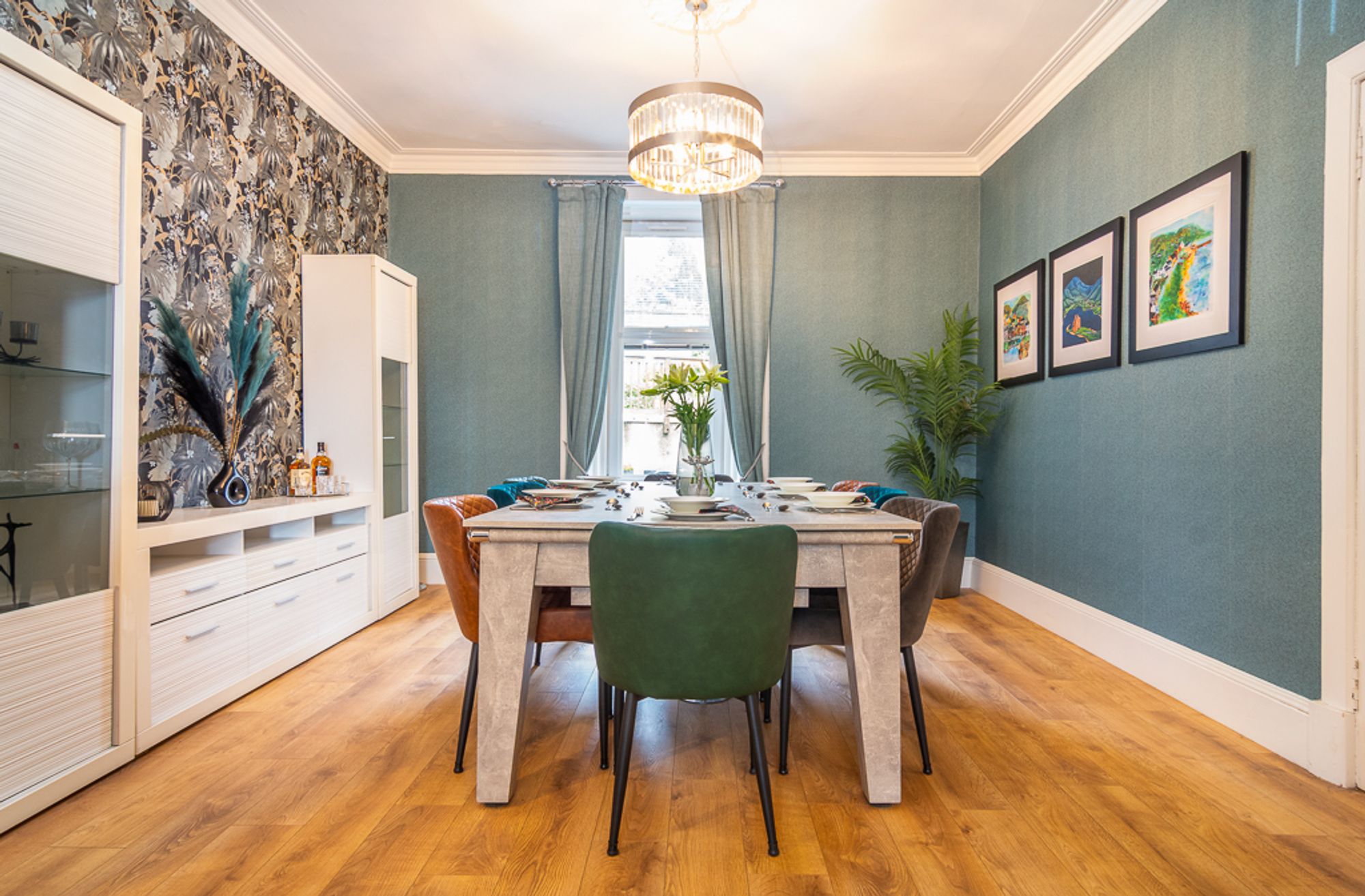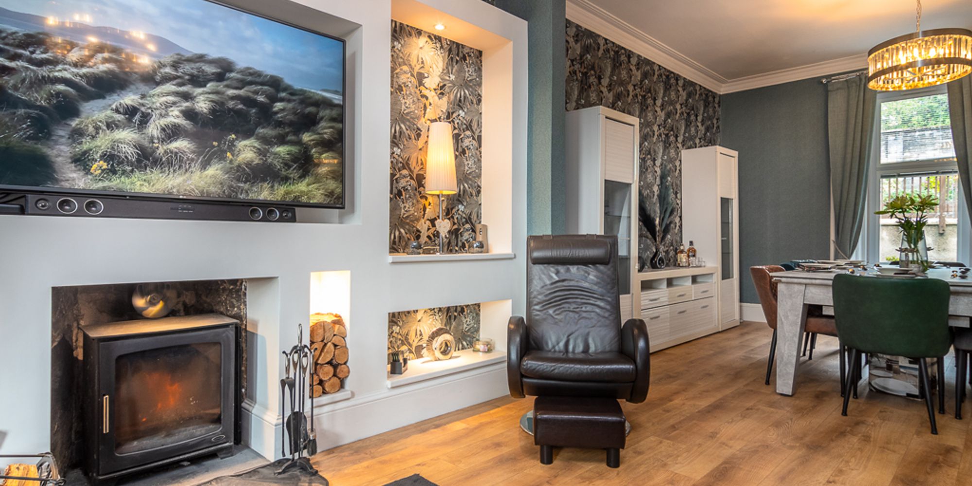 To the front, two reception rooms showcase different moods. The formal lounge is defined by a bay window, ornate cornicing, and an elegant ceiling rose, with a striking fireplace and mantle as the focal point. Soft green walls and warm-toned wooden flooring create a setting that feels both sophisticated and inviting. Opposite, a second lounge is designed for relaxed living, with an illuminated media wall, log-burning stove, and alcoves with space for neatly stacked wood. Open to the dining area, this space easily accommodates a full-size dining table, making it ideal for both family nights and entertaining with friends. Dual-aspect windows flood the room with light, balanced by soft drapes that give the space warmth and intimacy.