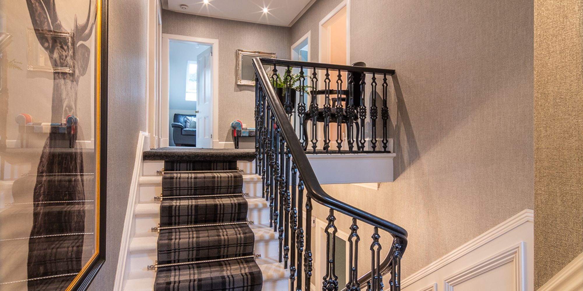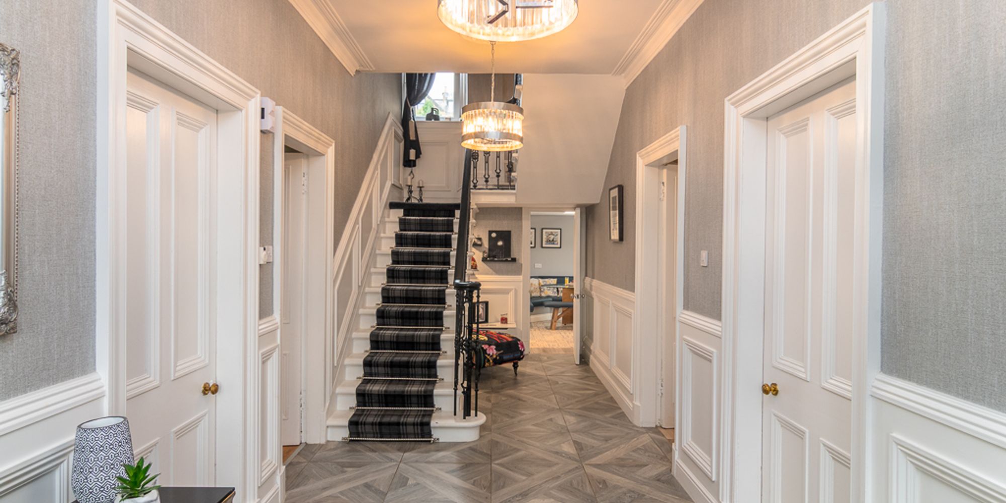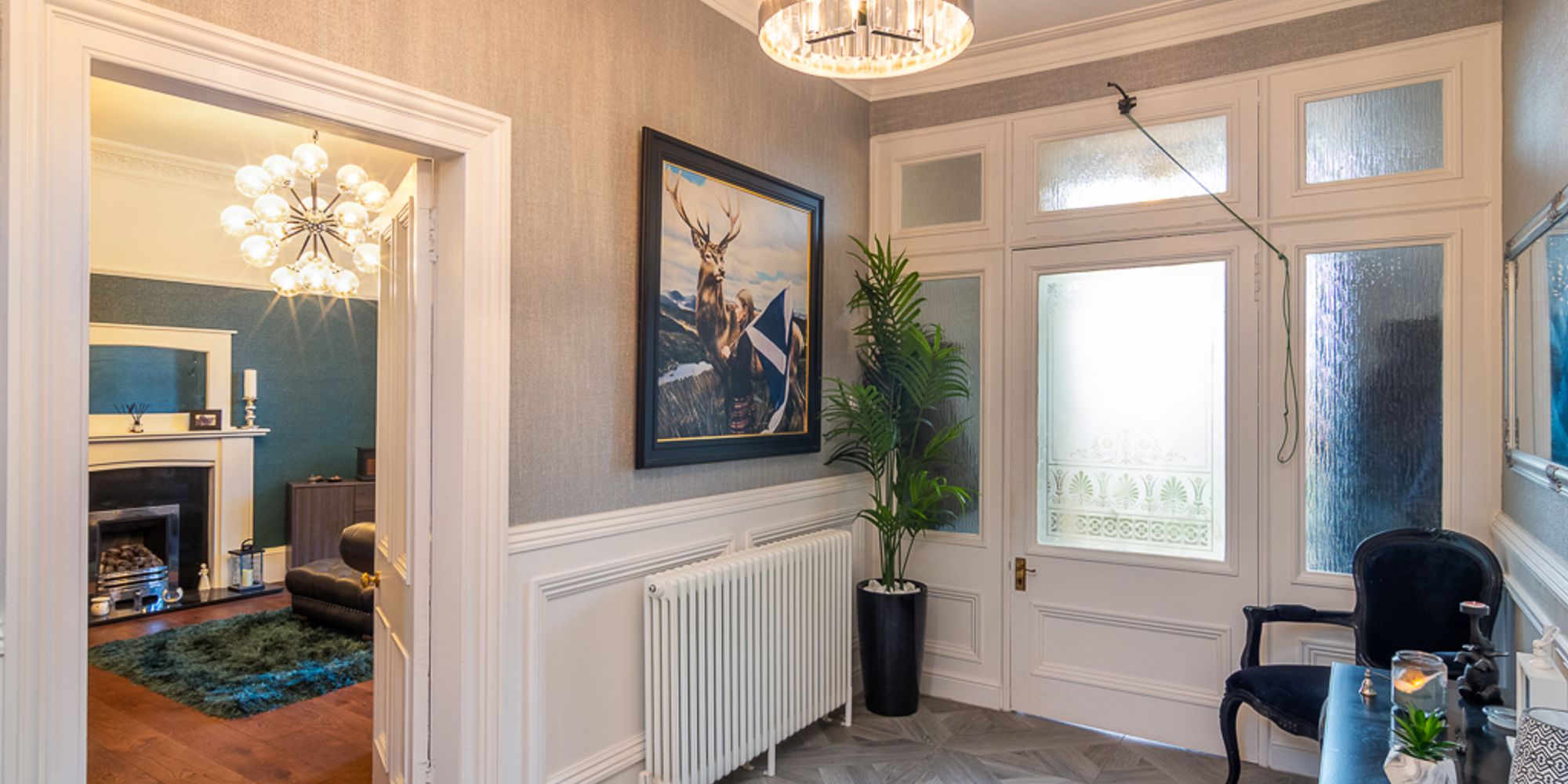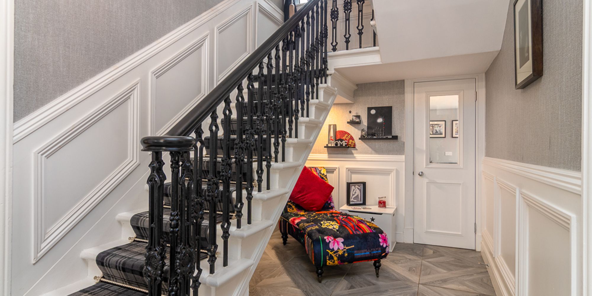 From the outside, a broad driveway with space for multiple cars leads to the entrance, where traditional storm doors open into a wide hallway. The scale of the home is immediately clear: high ceilings, original white wood panelling, and parquet-effect porcelain flooring bring light and refinement, while the original staircase with cast iron spindles anchors the space with period grandeur. Subtle details such as stair rods with thistle-inspired finials and a tartan runner softening each step add a distinctly Scottish character.