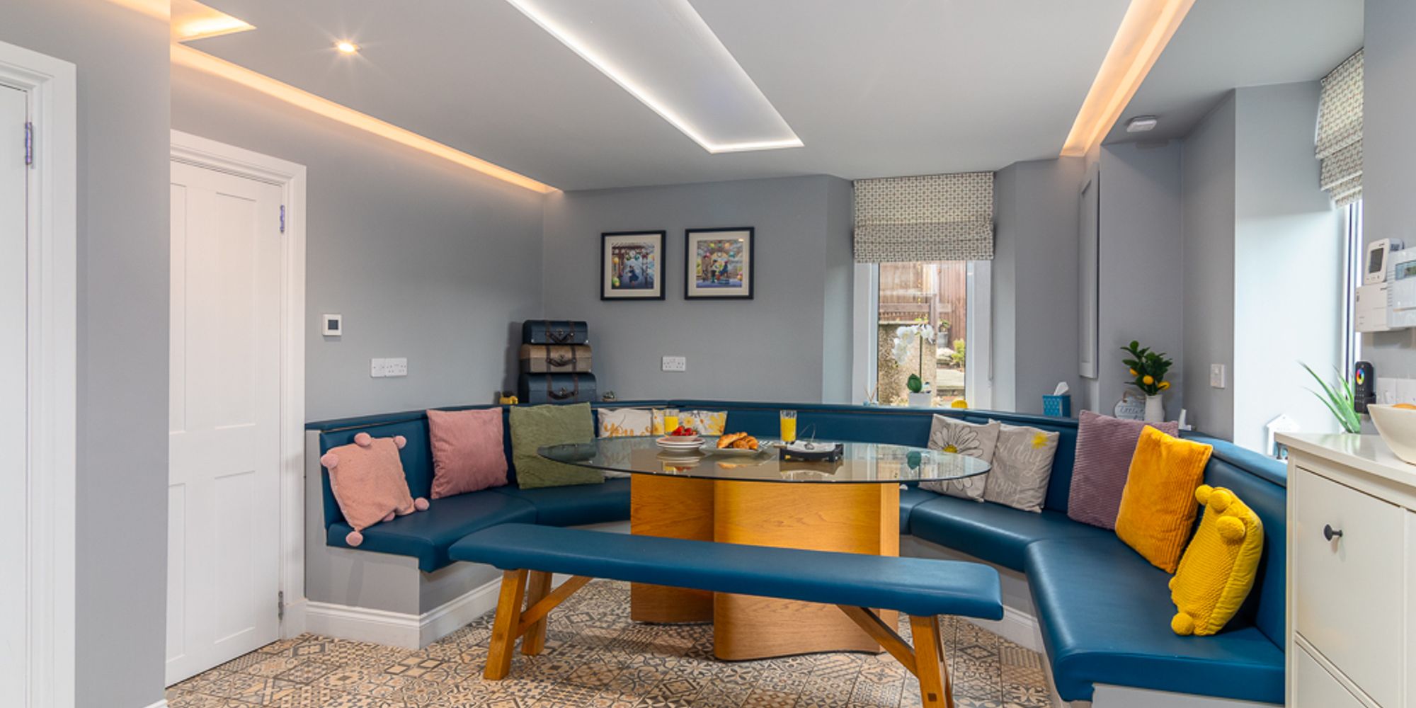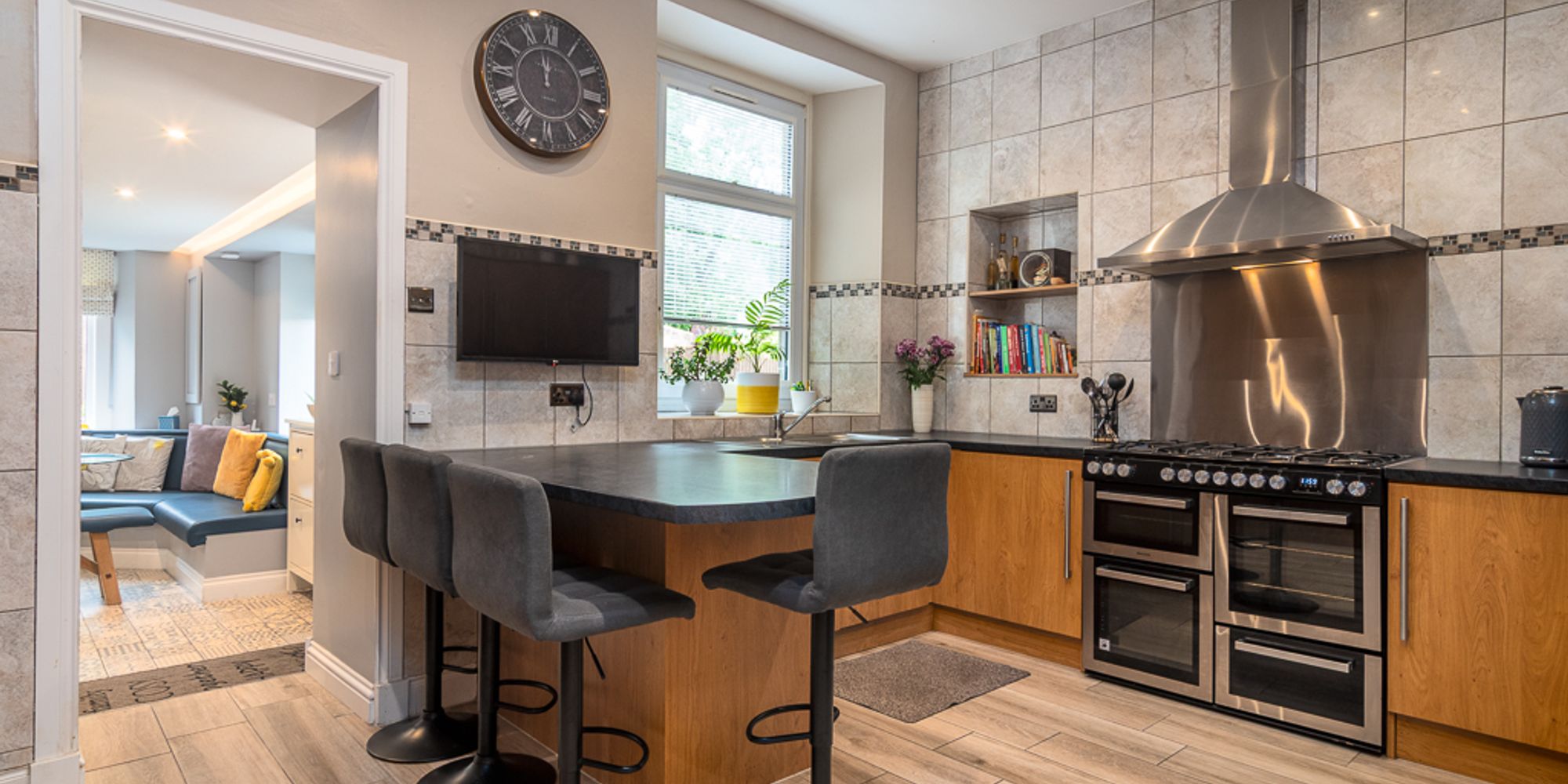 The kitchen is a welcoming hub of the home, finished with oak-toned cabinetry, sleek matt worktops, and a range cooker with 7-burner hob. A breakfast peninsula with black leather-finish stools makes everyday meals easy and sociable, while integrated shelving keeps essentials close to hand. From here, a door leads into the breakfast room, a bright inviting space featuring a upholstered, curved banquette that can comfortably seats multiple guests. Patterned floor tiles add charm, and doors open to the garden so gatherings can spill outdoors on sunny days.